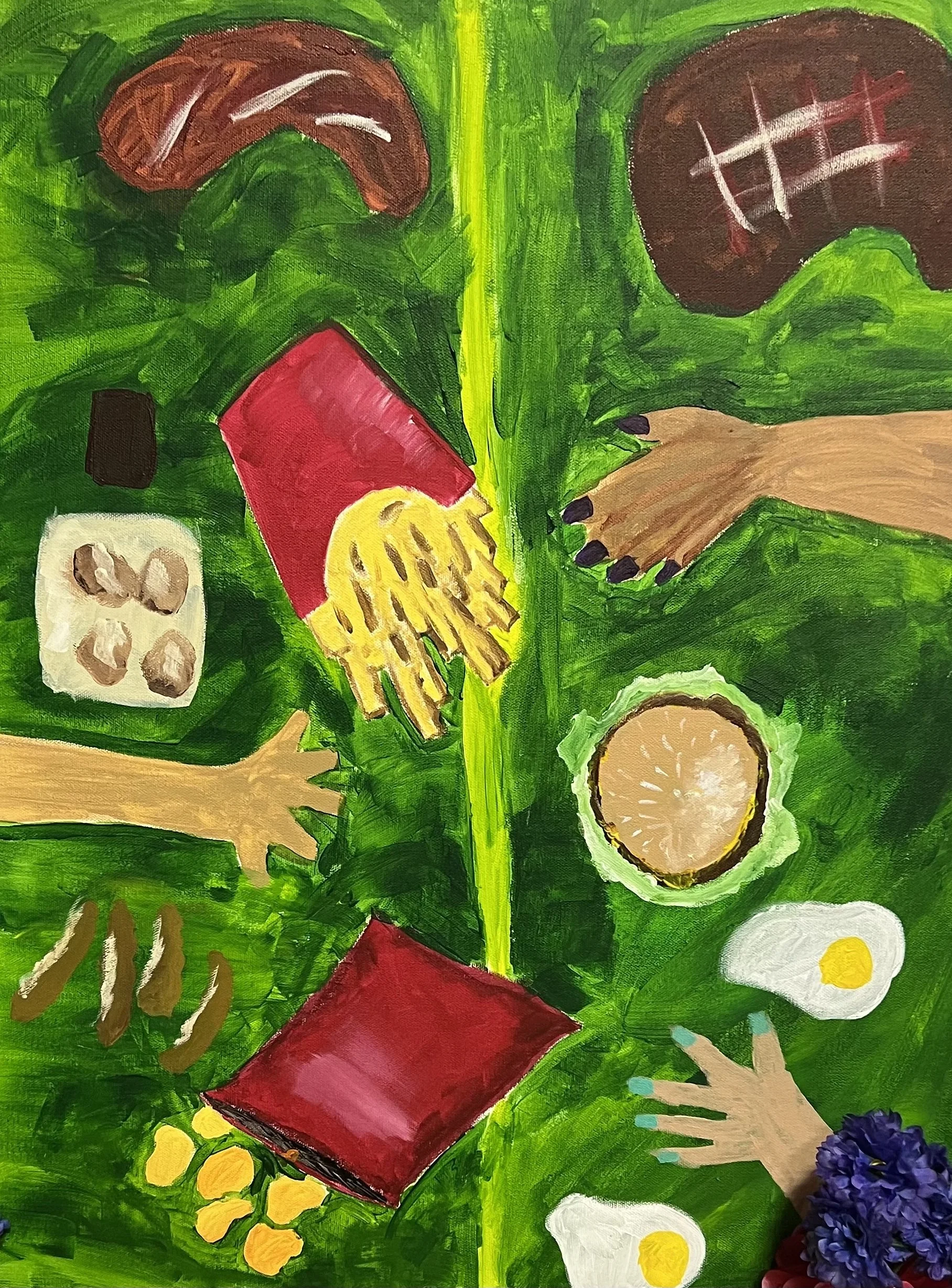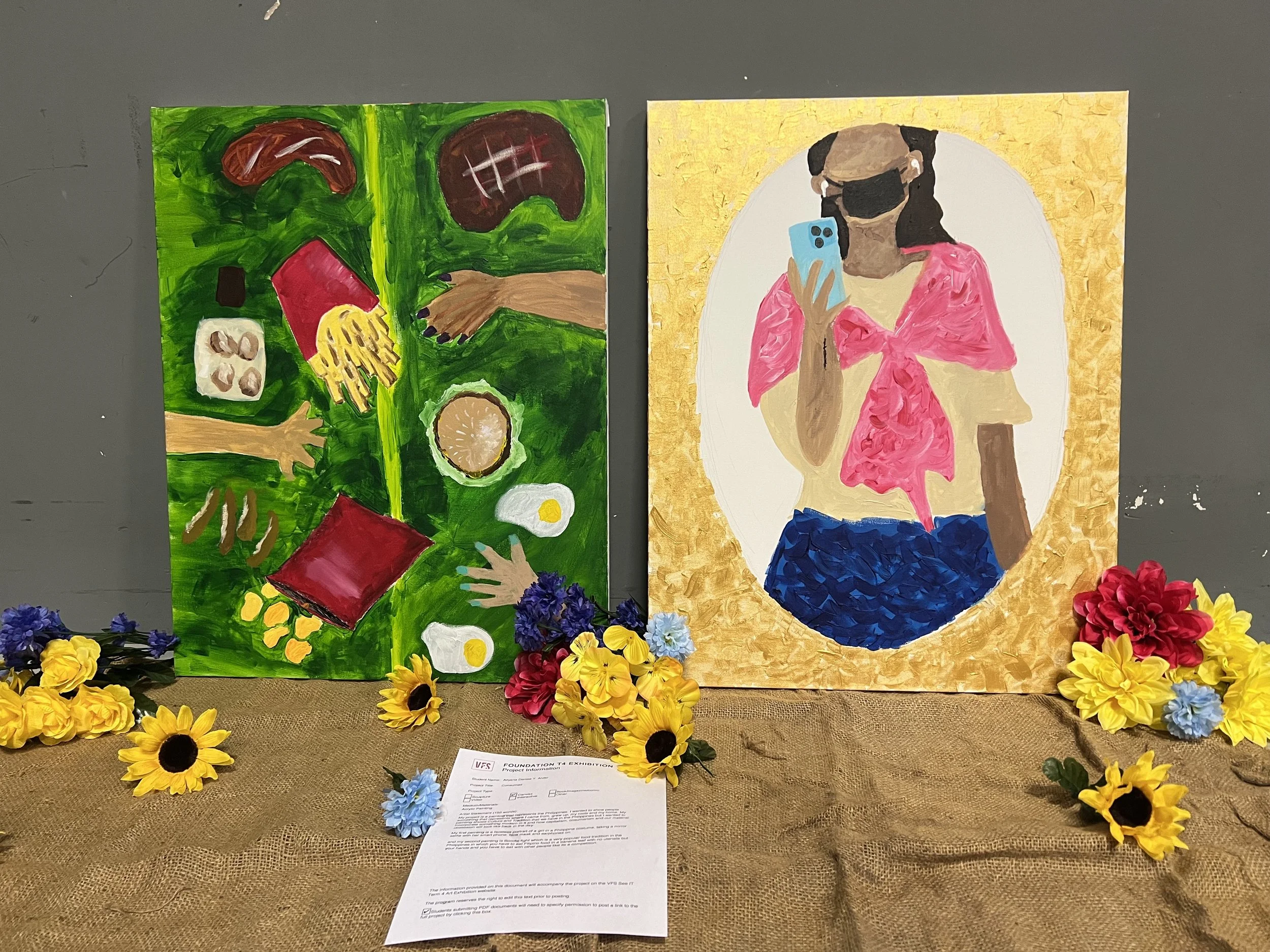 The second painting is a Boodle fight which is a very popular food tradition in the Philippines in which you have to eat Filipino food in a banana leaf along with other people, using only your hands and no utensils. It is like a competition.