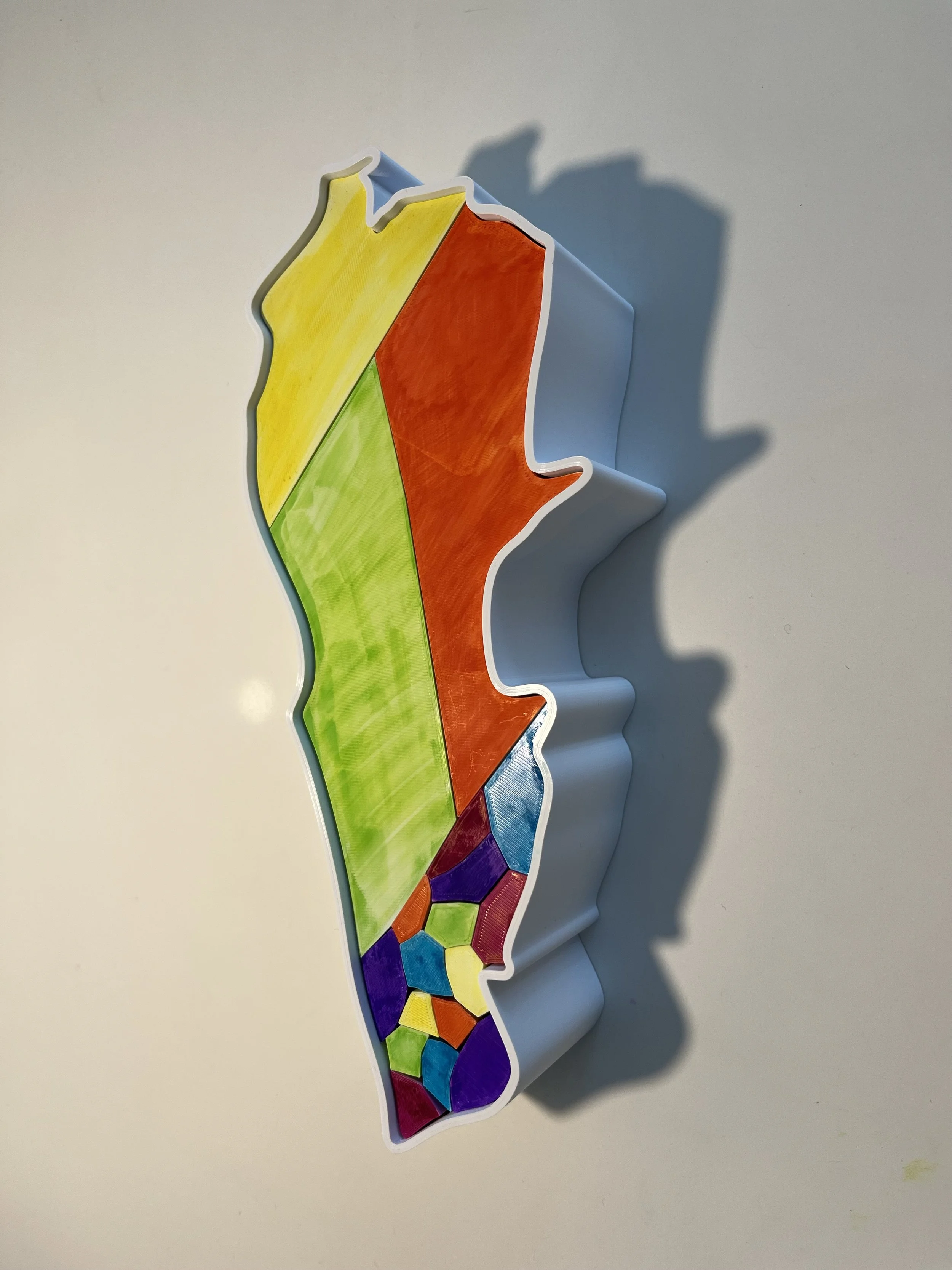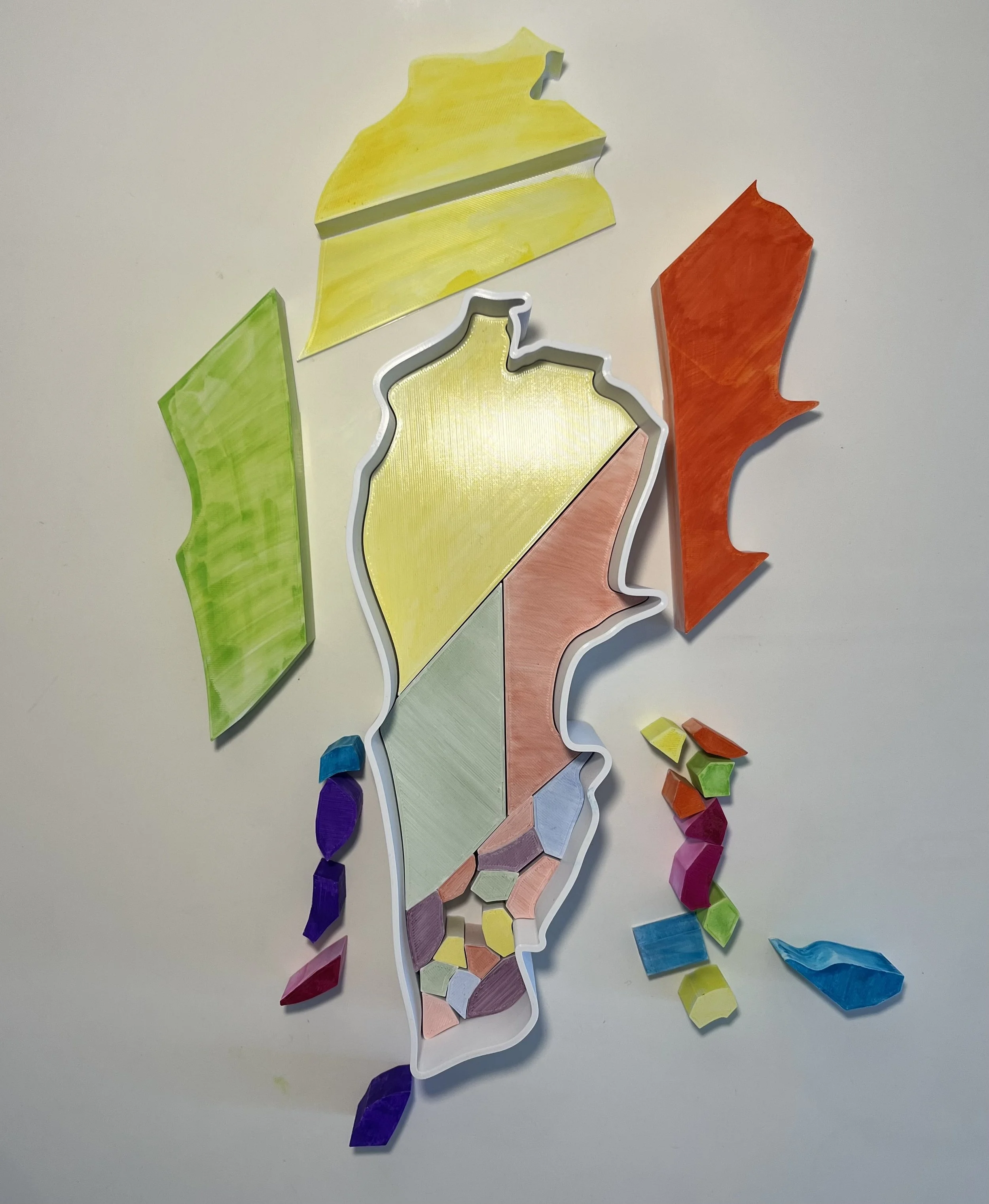 This 3D printed puzzle displays the 18 sects, recognized by the government, that form the Lebanese population. The first layer represents the 1932 census, in pale colors, and the second layer shows how the population has evolved since, in bolder colors.