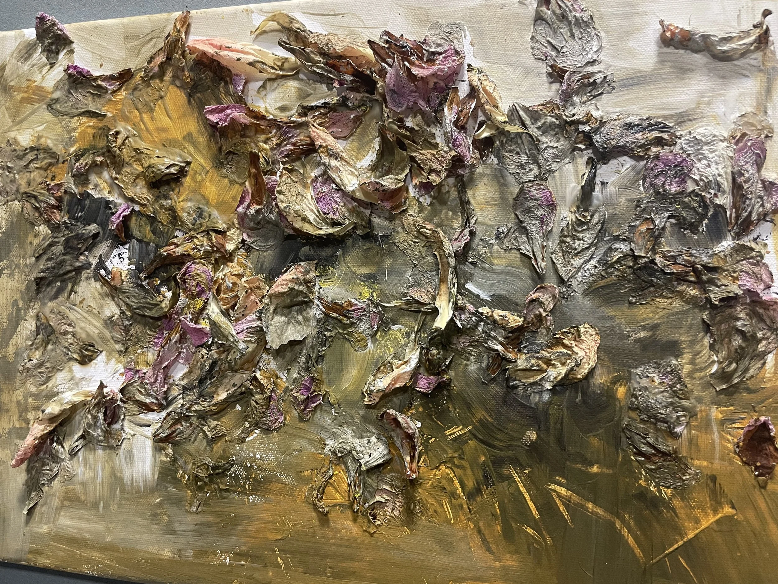 Cherry blossoms blooming are famous for their beauty of the fleeting moment. During Vancouver cherry blossoms season, it reminds me of a concept from Japan called "mono no aware" which means the awareness of impermanence, or transience of things. It is both a transient gentle sadness at their passing as well as a longer, deeper gentle sadness about this state being the reality of life. I recorded the process of a flower's death, sharing the emotion with the audience, and a Wabi-Sabi style painting with dead flower petals to commemorate the whole process of life.