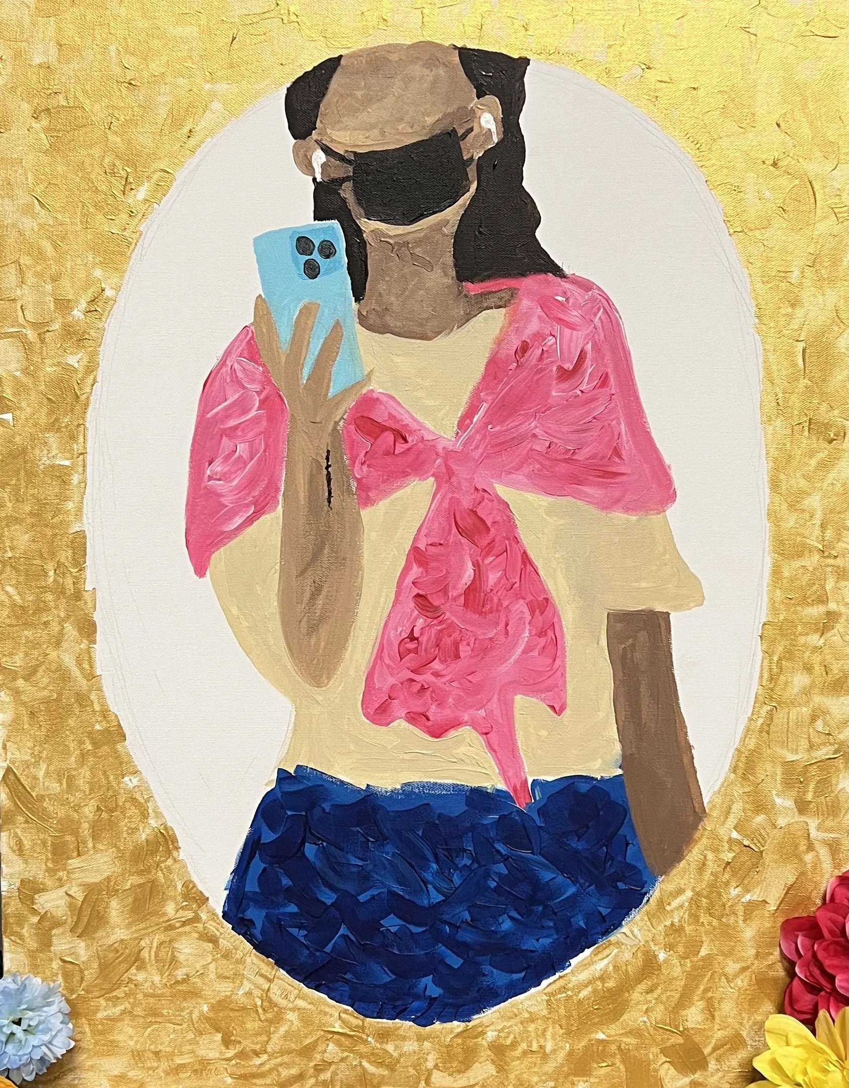 My first painting is a faceless portrait of a girl in a Philippine costume, taking a mirror selfie with her smart phone, face mask and airpods on.
