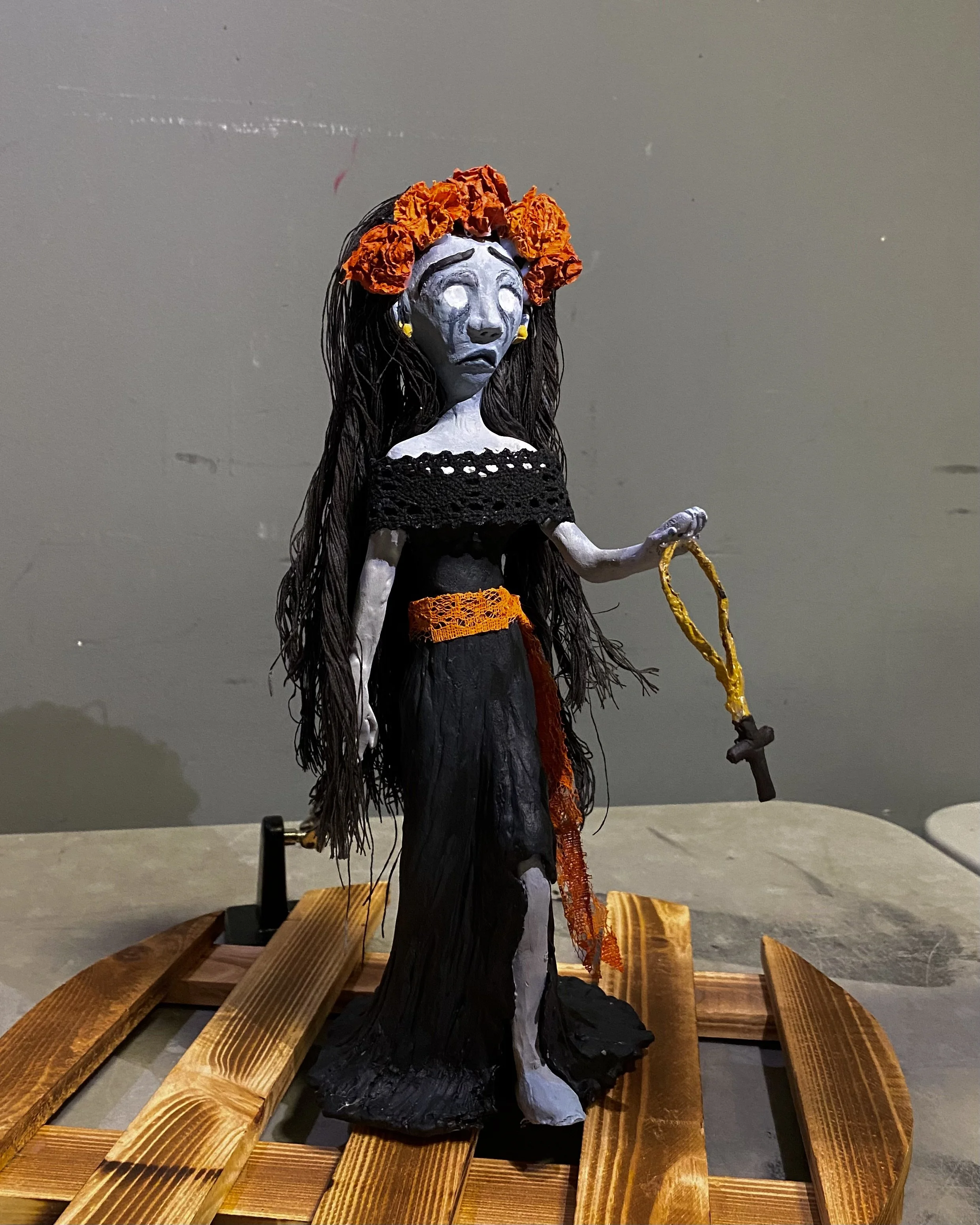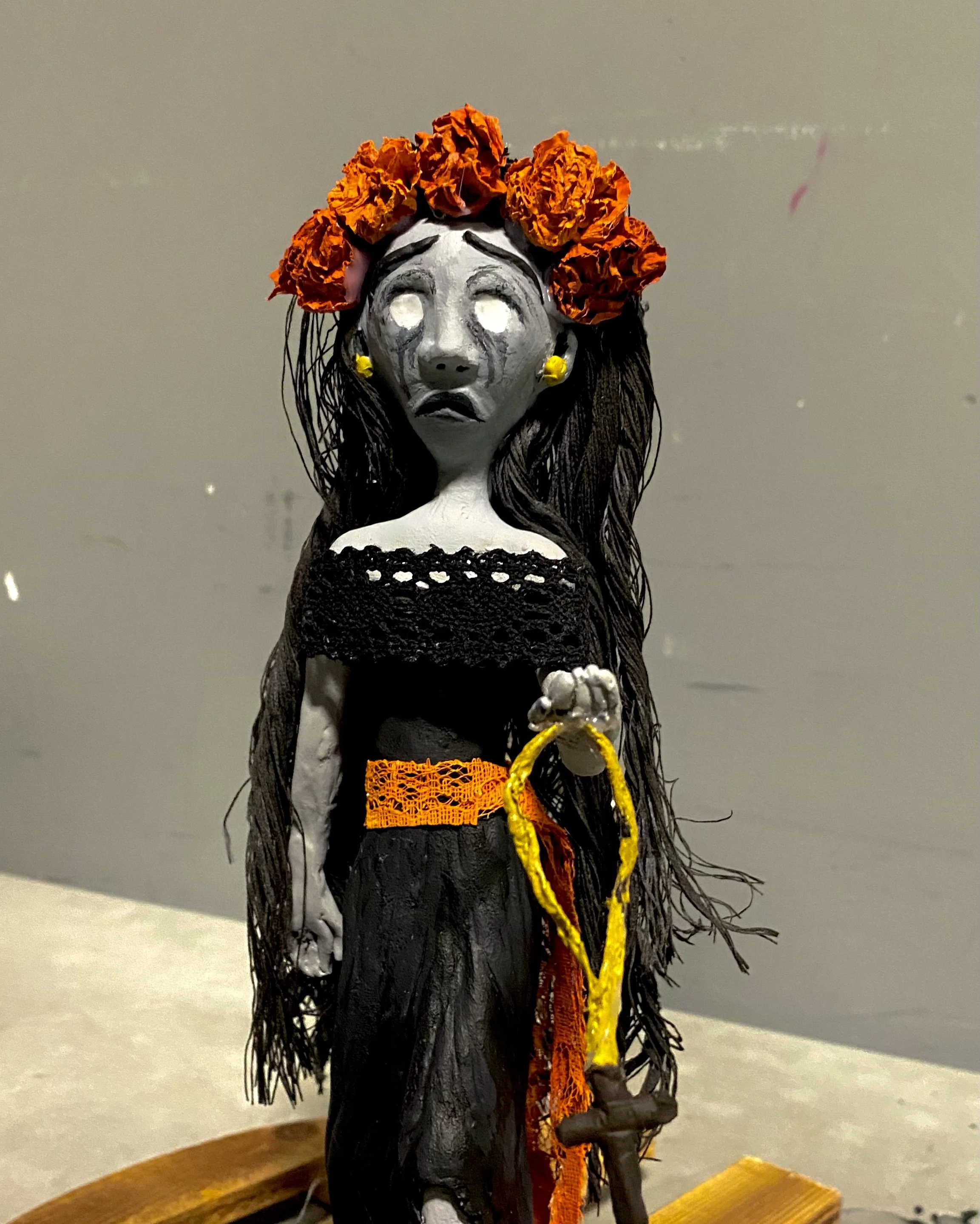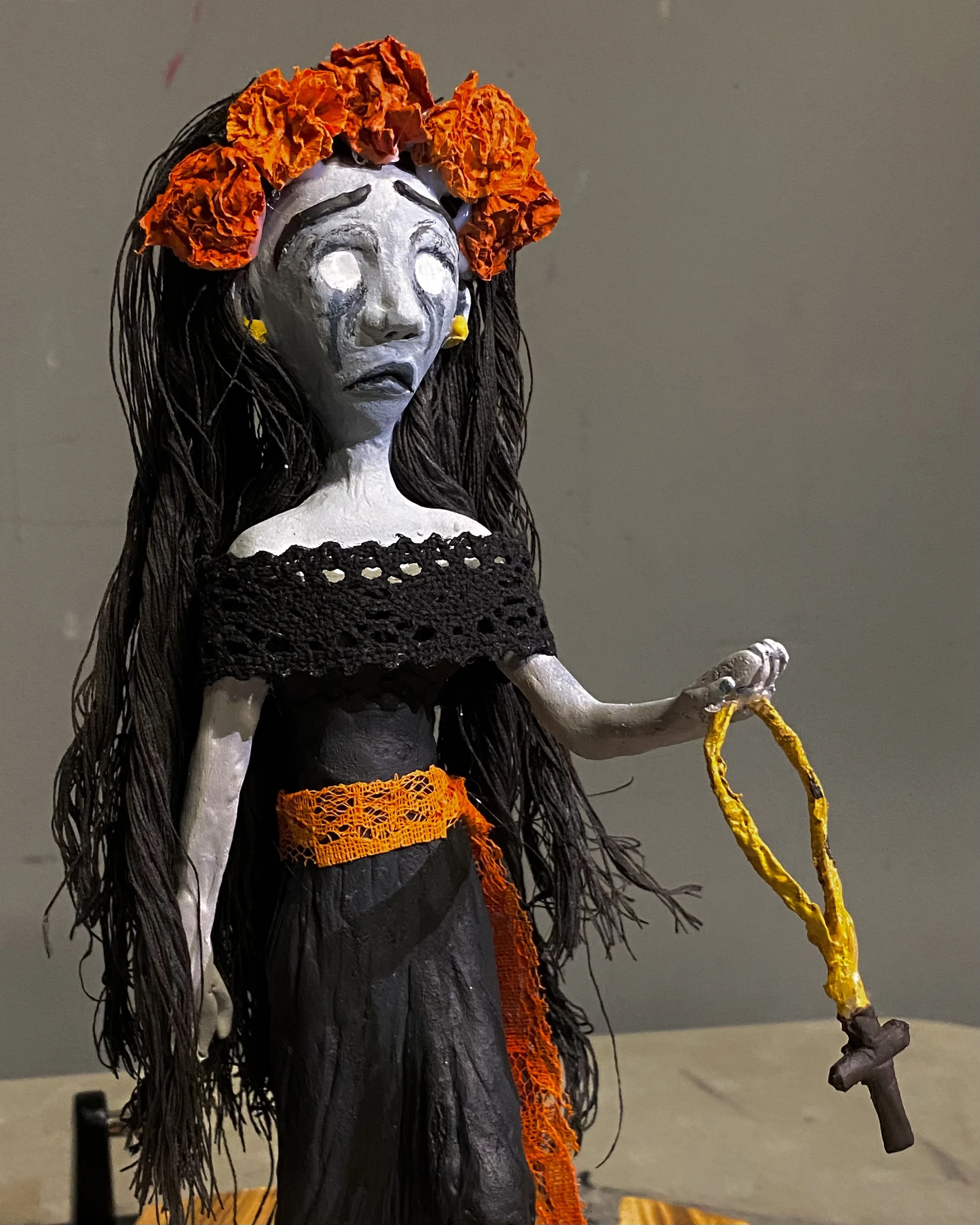 La Llorona is a popular Mexican Folktale I grew up hearing from my parents and family back in Mexico. It's a story I've always found fascinating and scary. I found it interesting to hear how the description of this famous character changed from person to person, however most would have the same description; white ripped dress, barefoot, scary looking face, black hair, filthy clothes. That is why for this project I decided to give her a new look and sculpt her as I've always imagined her. In my mind, I see her as a person that suffers, hence her facial expression. I also see her as someone that would dress particularly elegant which is why I added simple gold pieces of jewellery. And finally, I wanted to represent her in black clothing particularly since her story is a story of grief and sorrow as she is known for weeping the loss of her children she herself killed.