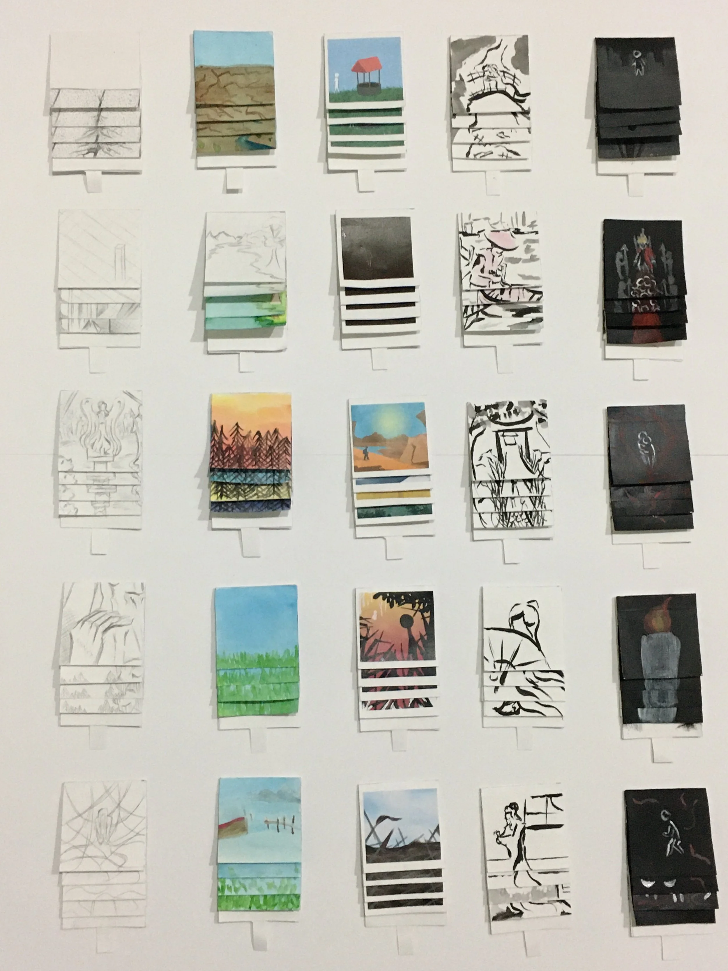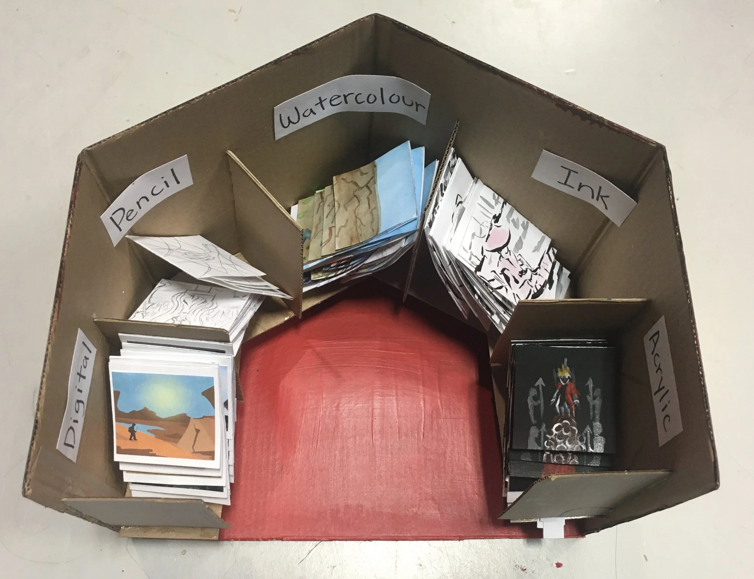This exhibition features 25 waterfall cards done with 5 different mediums. Each card tells a different narrative using only visuals. By using different mediums, I hope to convey a different feeling in each narrative and explore the art of storytelling. I want to focus on storytelling because I’ve always been fascinated by those who can tell a whole story with just one picture. To do this, I’ve decided to use waterfall cards to help display my narratives, and every time a new image is revealed, the story progresses. I’ve decided to display my waterfall cards in a miniature library bookshelf because it’s like a collection of miniature stories, and it will help my theme of storytelling. Overall, I am quite proud of what I have accomplished and I have learned many new skills that I can use in future projects.