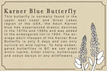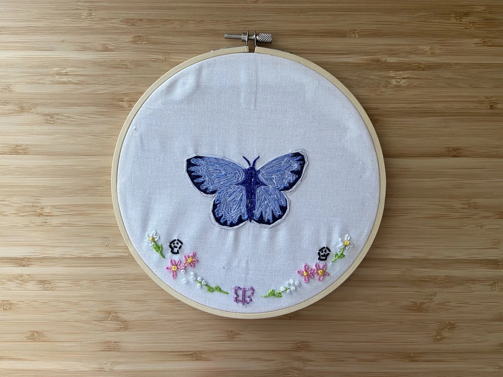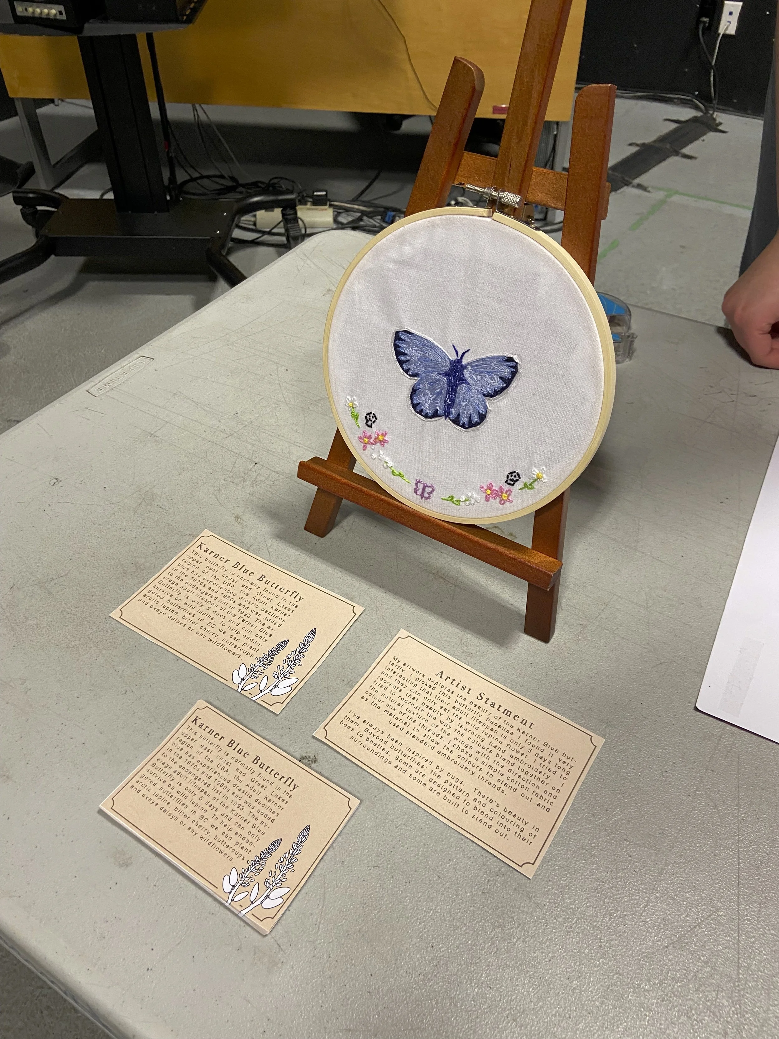 My artwork explores the beauty of the Karner Blue butterfly. I picked this butterfly because I found it very interesting that their adult lifespan is only 5 days long and they can only eat the wild lupine flower. I tried to recreate that beauty by learning hand embroidery. I tried to recreate the way the colours blend together on the natural texture of the wings with the direction and colour mix of the threads. I chose a simple cotton fabric as the material to allow the colours to stand out and used standard embroidery threads.