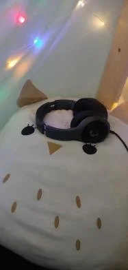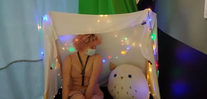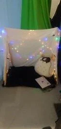 My project is a simulation of how I, as a person with adhd, relax when I'm experiencing overstimulation. A comfortable, small, soft area where I can listen to some chill music. I did my own vocals and built a blanket fort with some of my favourite blankets.