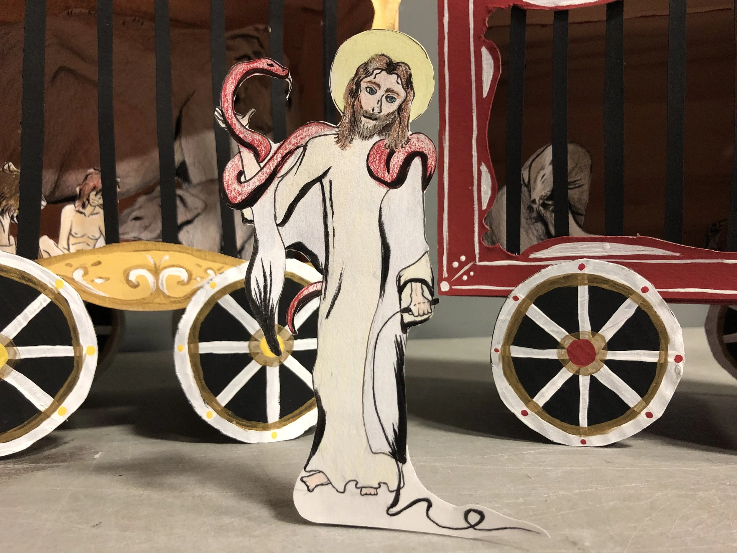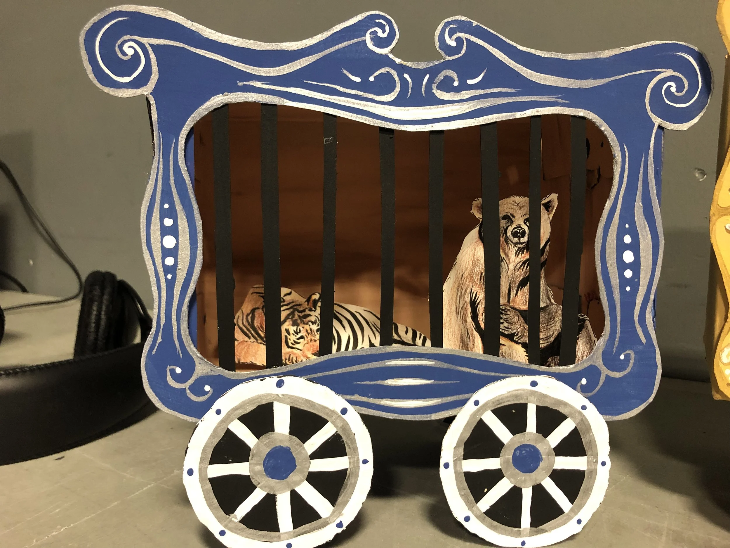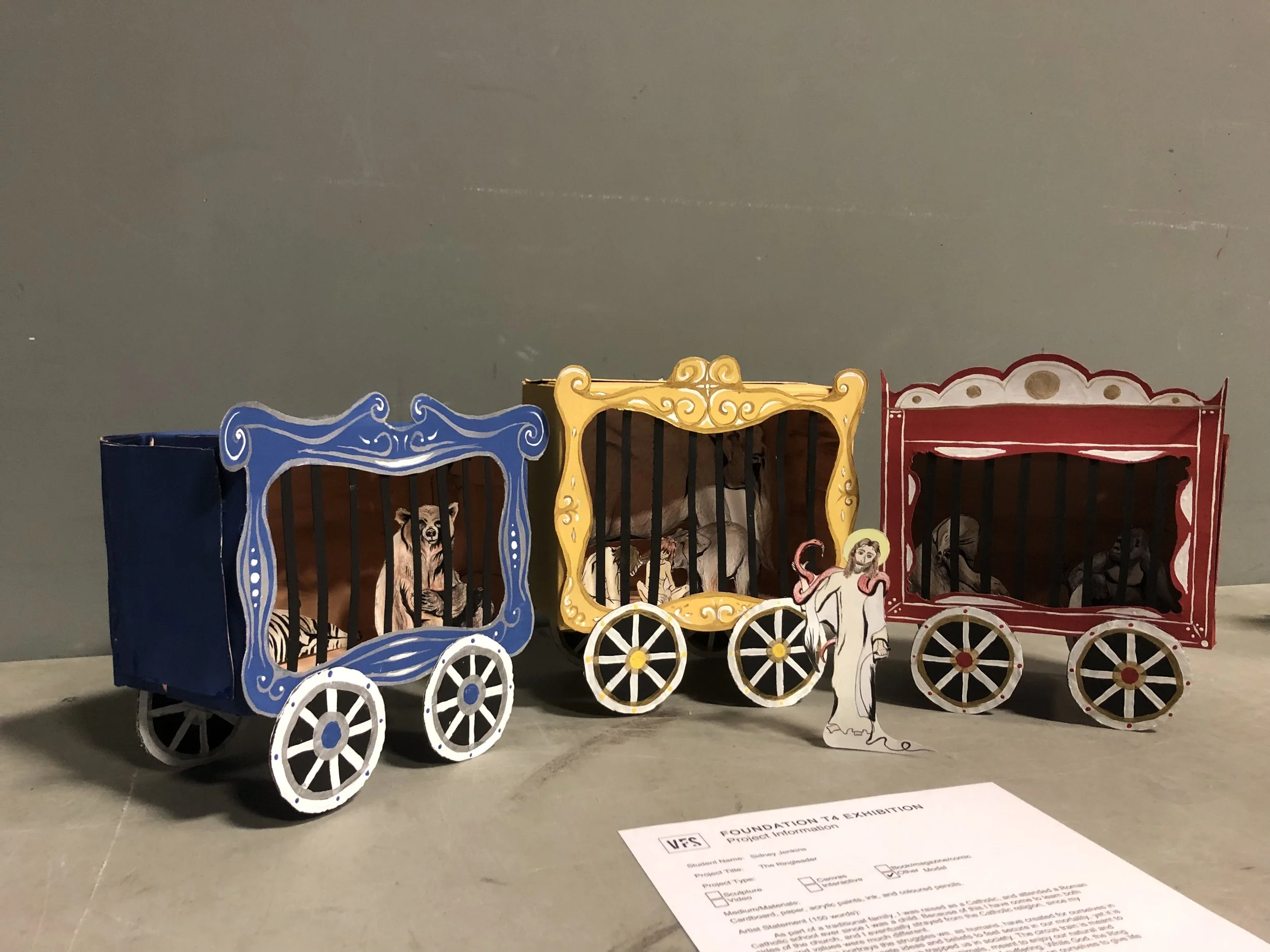 This piece portrays the struggles we, as humans, have created for ourselves in a modern society. We create ideas and beliefs to feel secure in our mortality, yet it is those beliefs and ideas that have trapped us in society. The circus train is meant to represent that we as humans are also animals, meant to enjoy our natural and primitive instincts, however we are caged in, and suffering. While God, the Ring Leader, represents the restrictions and limitations we put on ourselves to give life meaning.