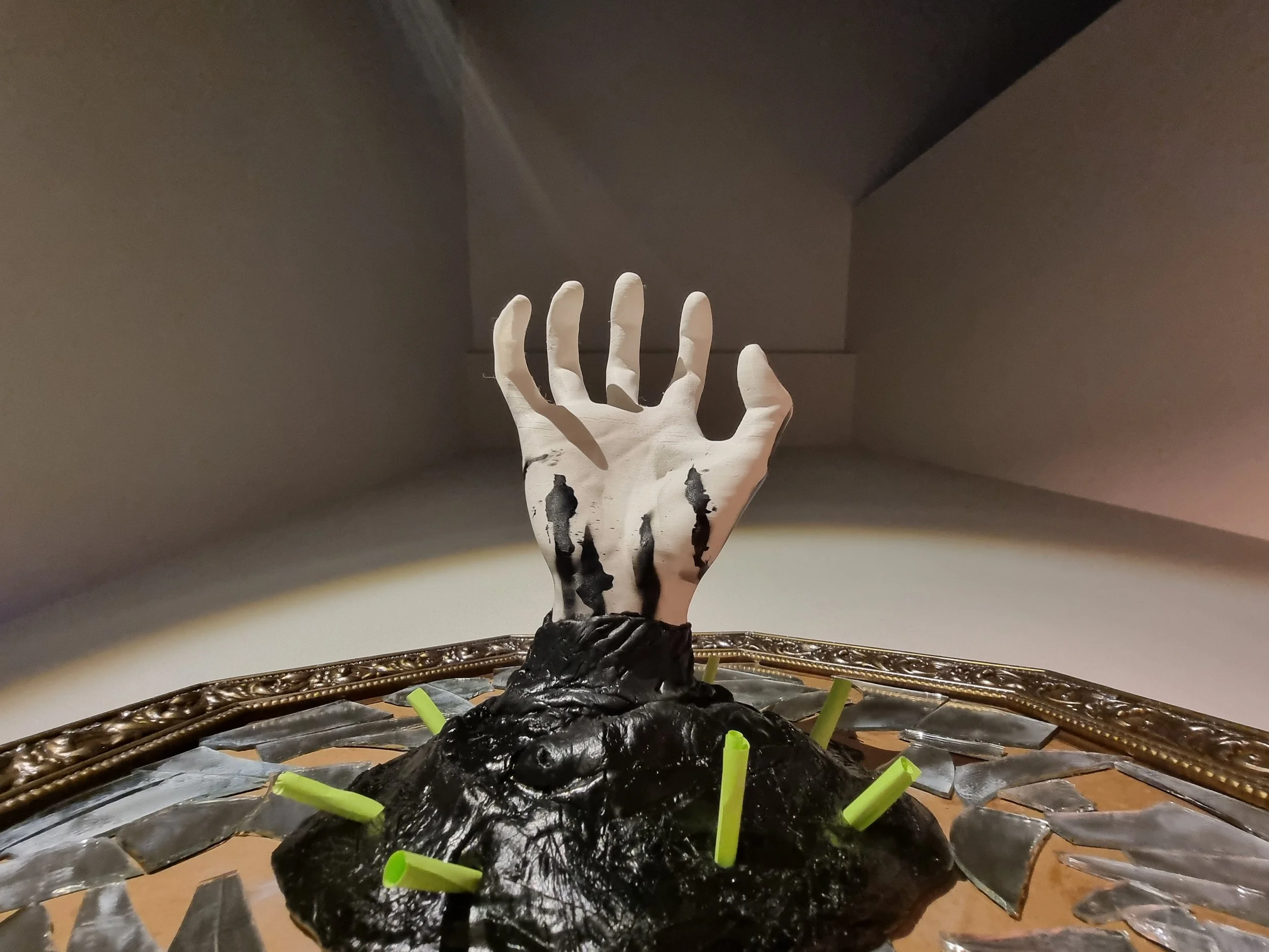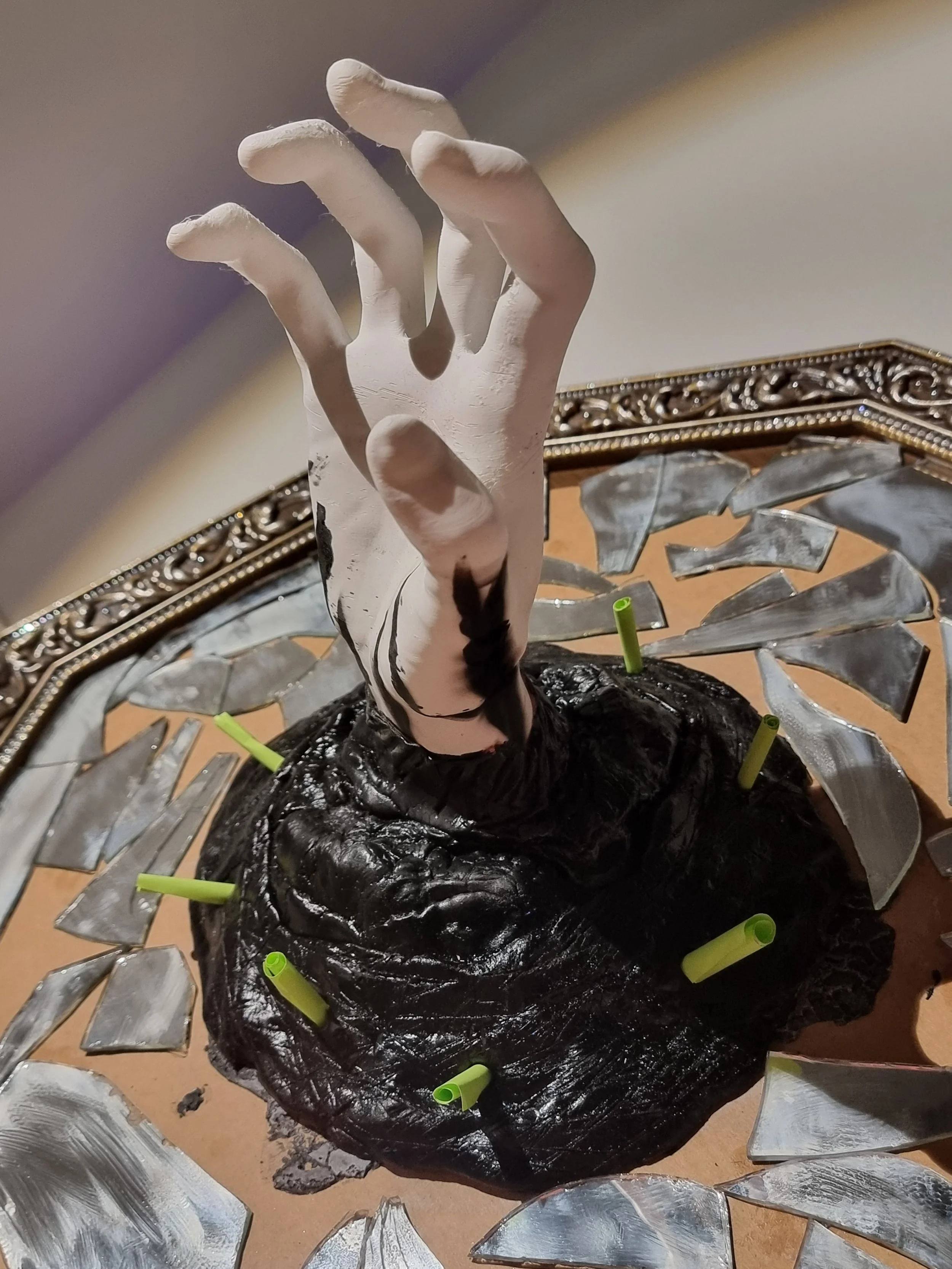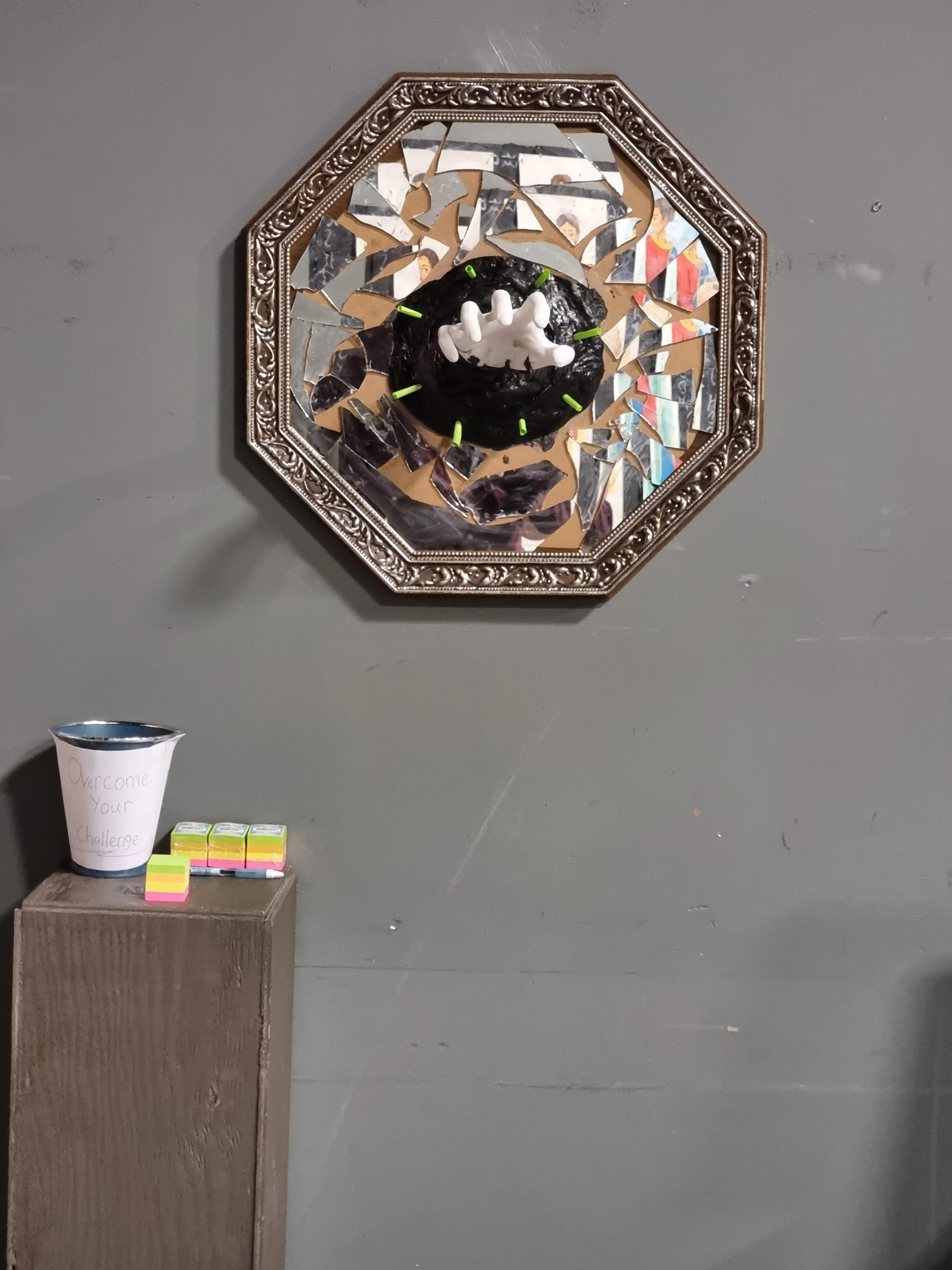 Mirrors have always been part of our everyday lives. We see it every time in the washroom, but when was the last time you took a good look at yourself and reflected on your life? Everyone has their own challenges and battles. Reflection, invites you to tackle your challenges. It is an interactive sculpture; the base of the sculpture is made of clay and designed to mimic the idea of being pulled in. The hand is 3D printed, designed to mimic tension towards the individual trying to escape. These are then glued to an empty shell of a mirror and accompanied with broken mirror fragments simulating an everyday mirror. The interactive aspect is where there are holes with scrolls that act as life challenges surrounding the sculpture. The audience have the decision to tackle the challenge and replace it with another challenge or choose to read the challenge and back down.