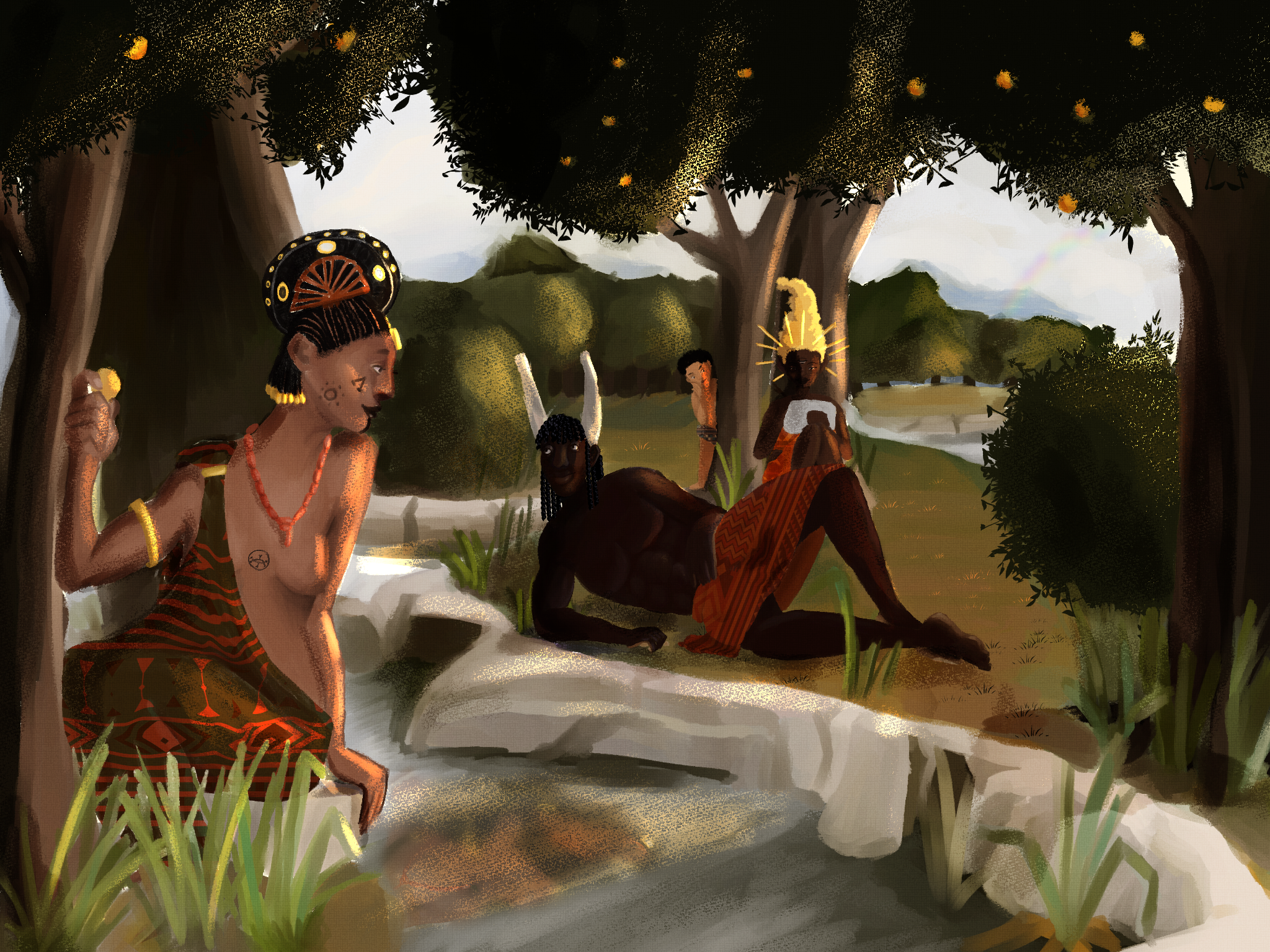 The characters in the field are some personal interpretations of some gods and goddesses of Ọdinani mythology. From L-R: Ala (Mother Nature), Ikenga (god of strength), Ekwensu (god of tricks and the tortoise) and Anyanwu (eye of the sun).