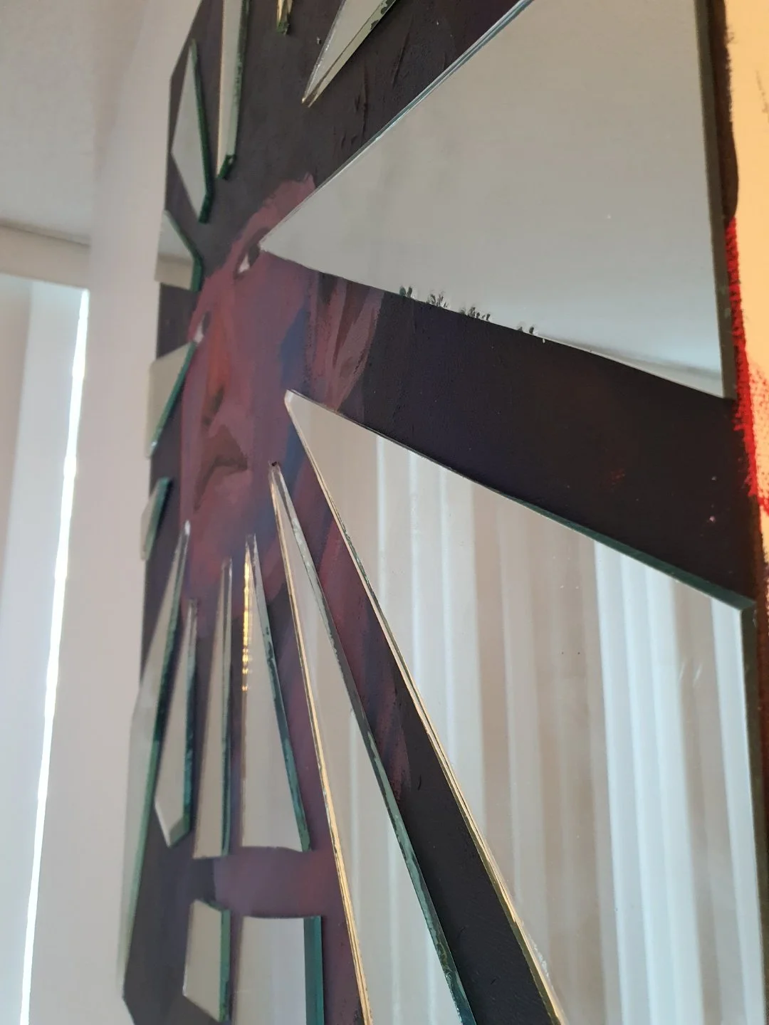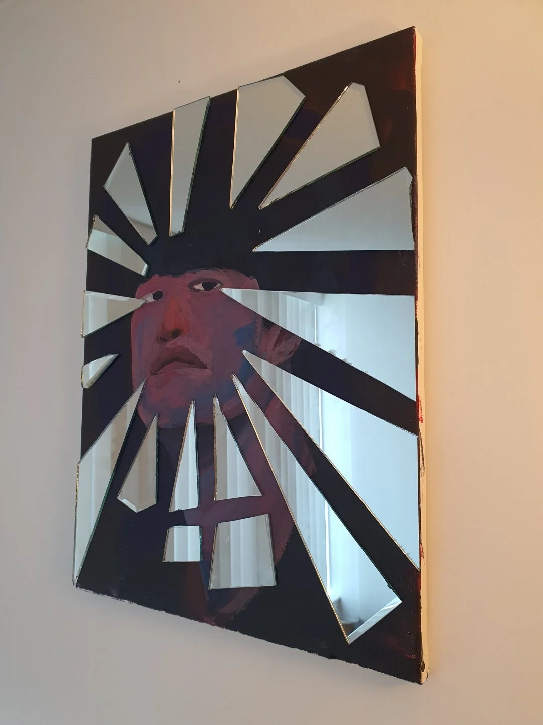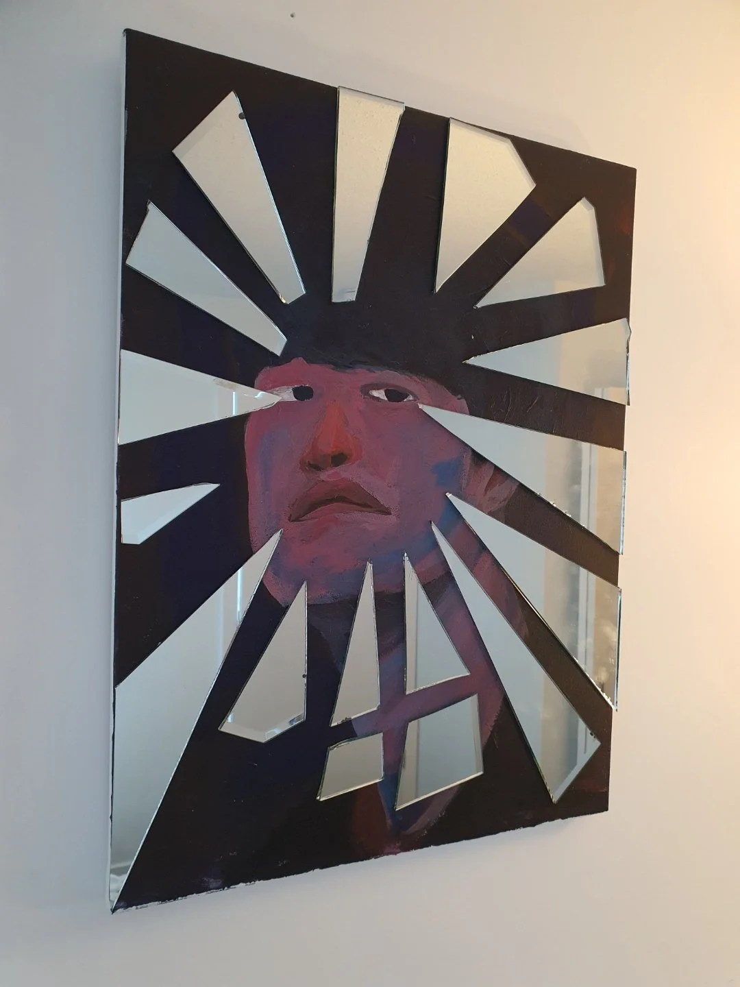 One's Eye is paint with mirror collage. This is a self-portrait. Through this work, I express the owners of the eyes that surround me. This is a painting of what I feel in the eyes of other people. Not everyone does, but sometimes, some people judge with prejudice that I'm Asian. For example, "Oh, that person is Asian, so he will not be able to speak English." "He wouldn't know this." I am not an unbiased person and I've also judge people before. But after I came to Canada, I knew what my behaviour was like. In this work, I wanted to show them directly what the owners of the eyes look like when they wear coloured glasses or judge me.