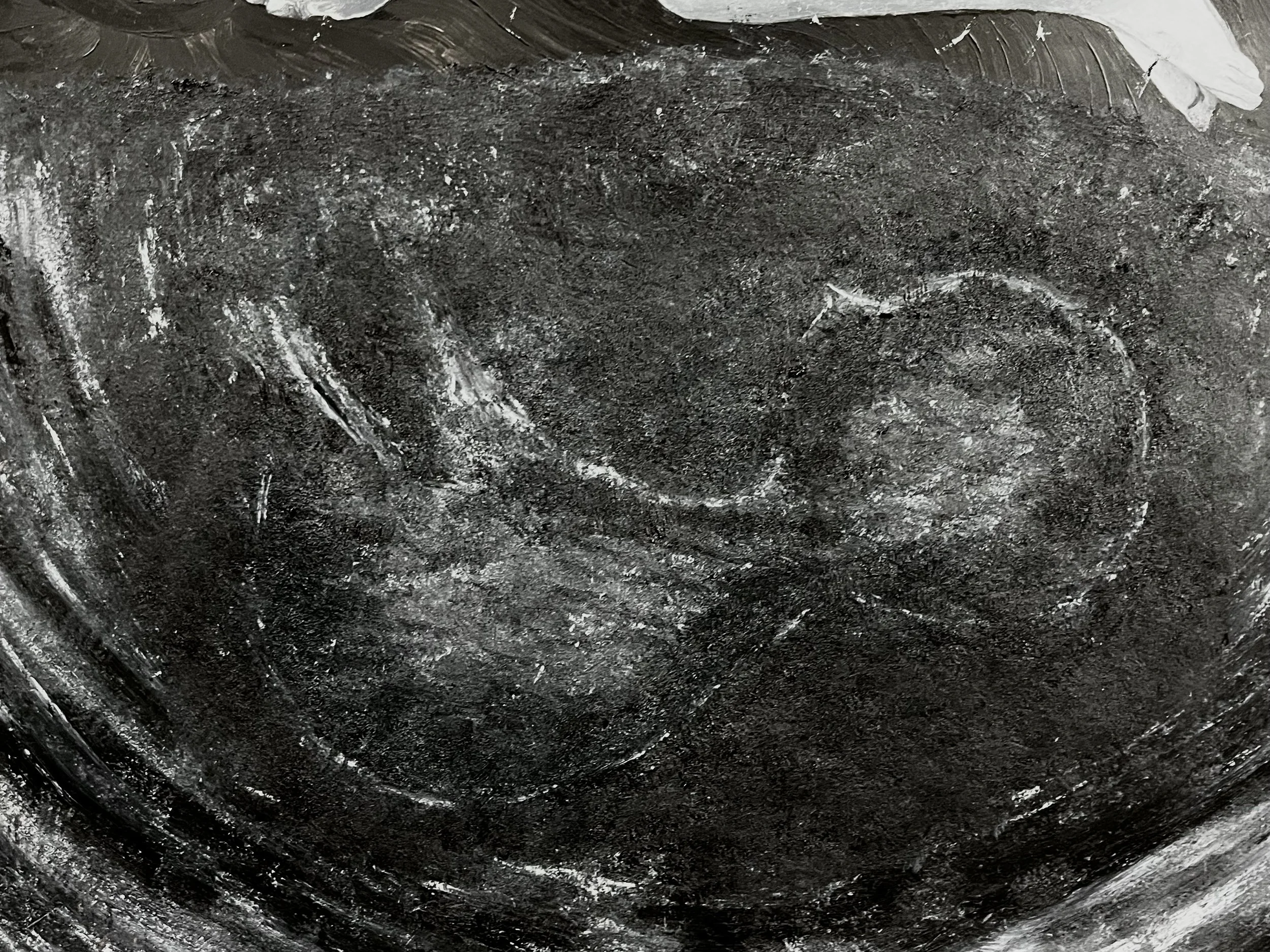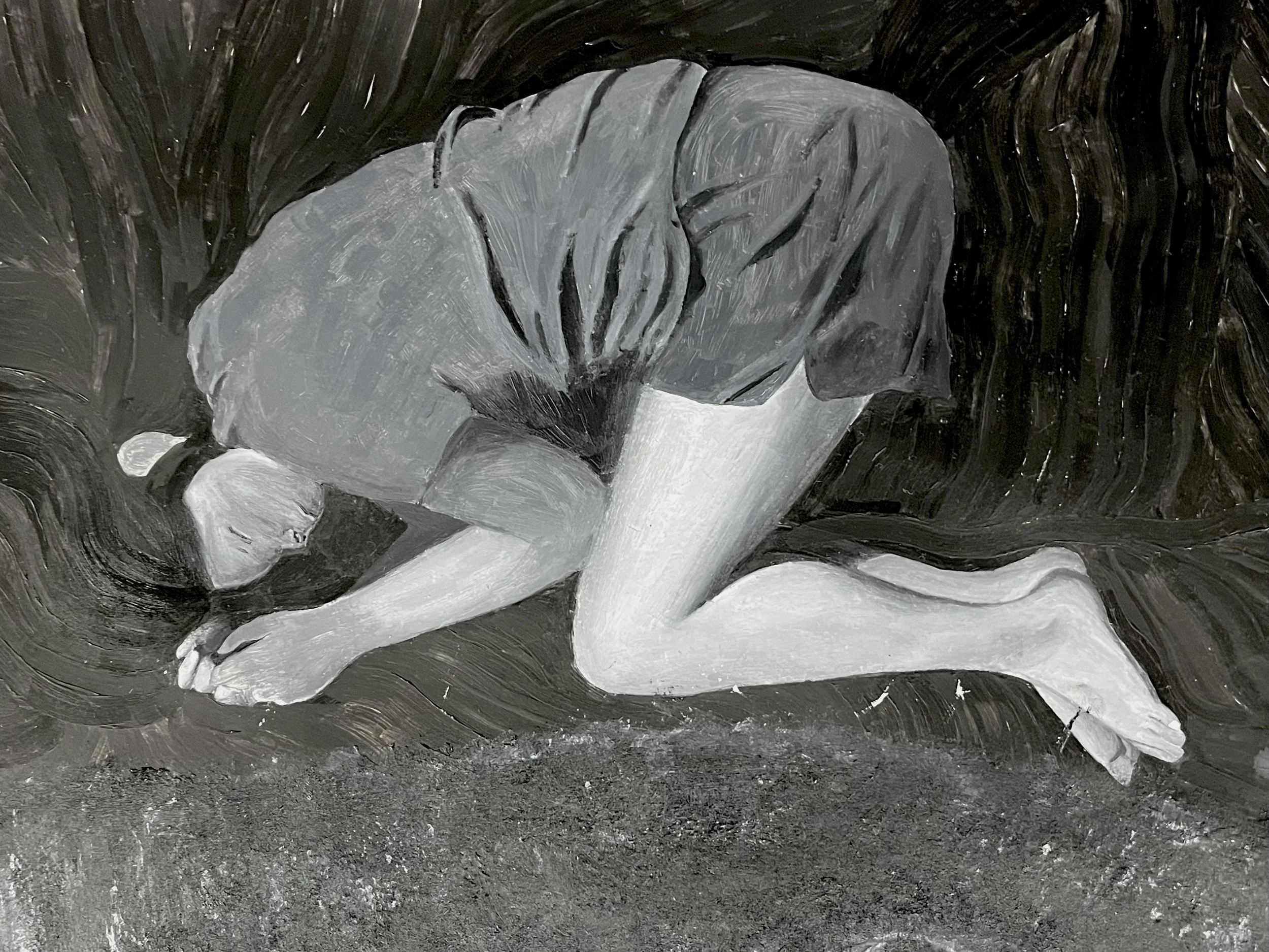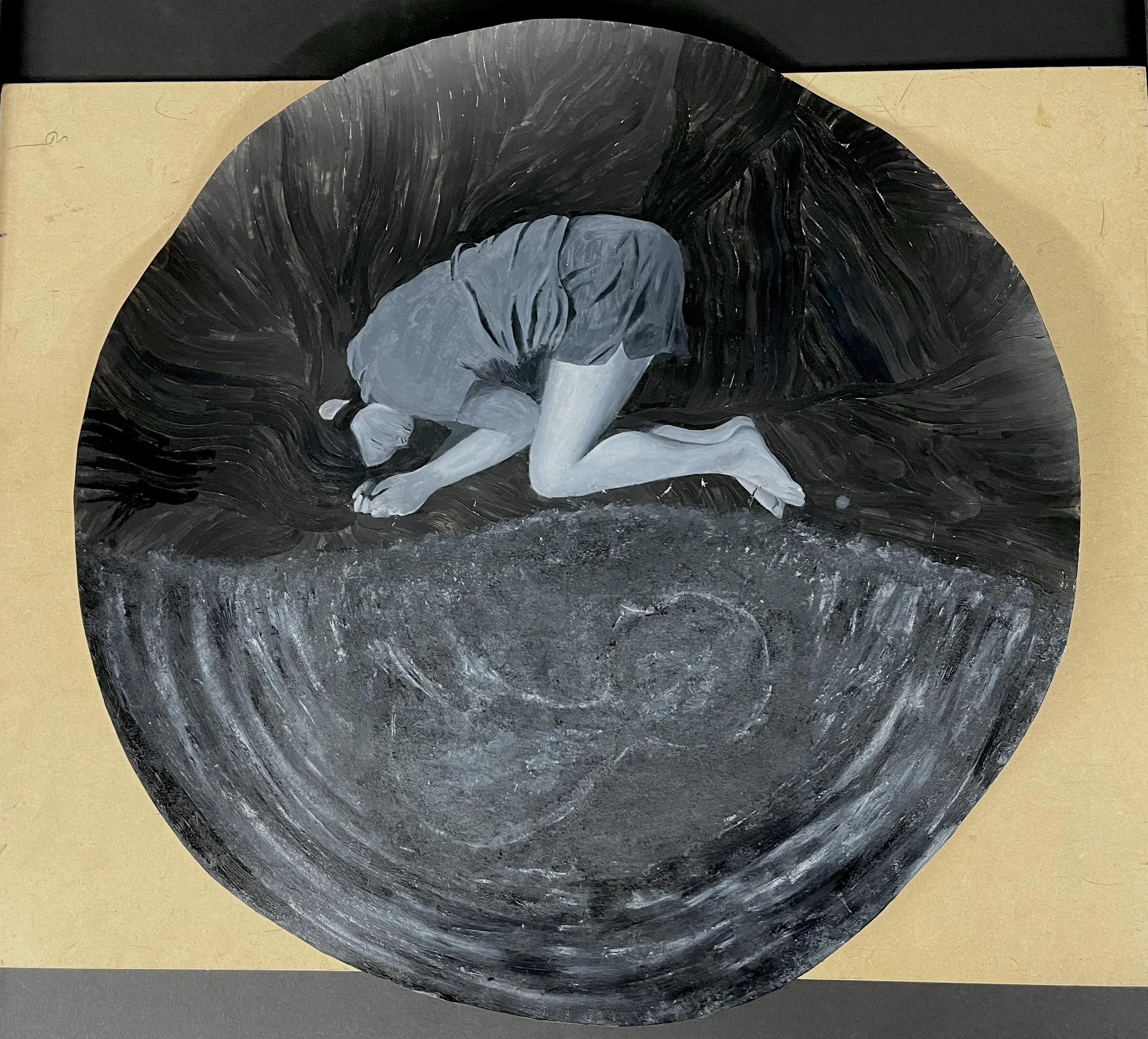 The emotions I usually experience became my source of inspiration. In this piece, I chose to concentrate on the emotion of "fear," specifically the fear of failure. Despite knowing that no one can be perfect, this deep-seated fear makes me want to run away from everything and do nothing, putting me in a vulnerable state, like a baby. That's why the lying figure in the painting is facing fear represented as a fetus form. And I decided to use oil paint, a tool that I have always wanted to try. Although the work is largely divided into two sections, there are two reasons why it is expressed in grayscale overall. Firstly, I wanted to add uniqueness by depicting the fetal part in a manner reminiscent of an ultrasound image. Secondly, I felt that the static and subdued quality of black and white color matched the theme of the painting Moreover, the color of the gray tone effectively conveys the feeling of lethargy by making the human figure look like a stone.
