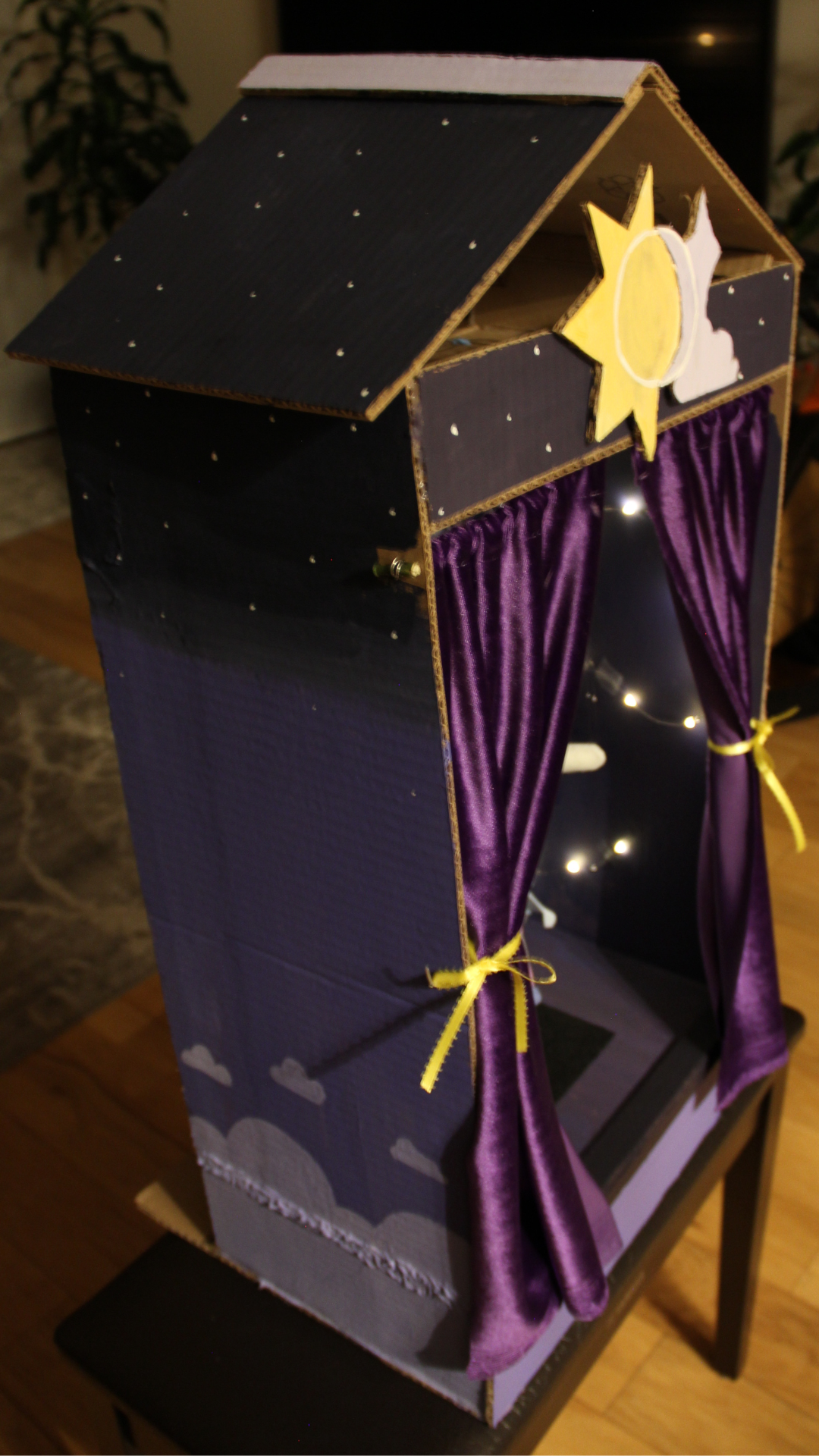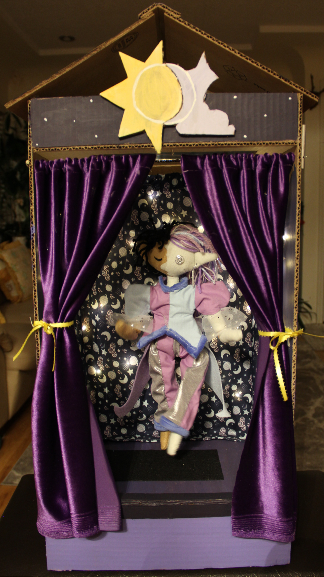 Like a music box, I hope to display it in homes to watch occasionally and act as if I am watching a performance. The rag doll is split down the center as it dances upon its cardboard stage.