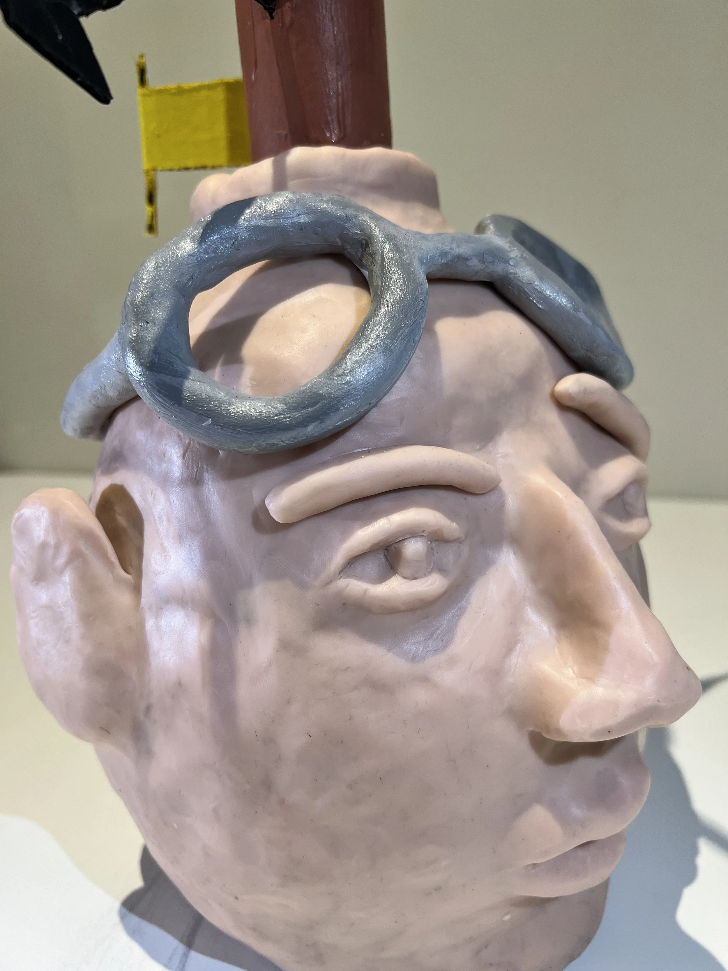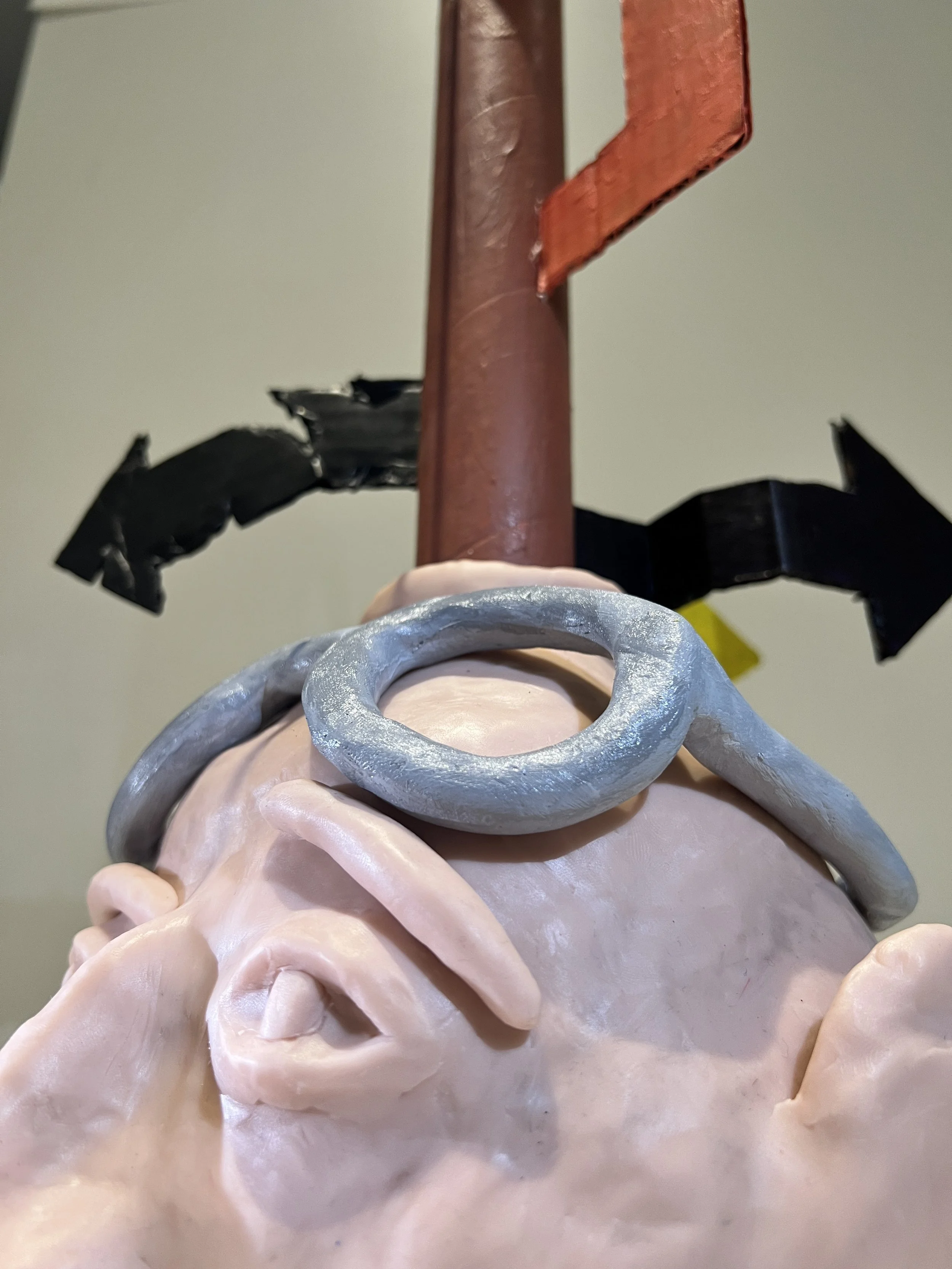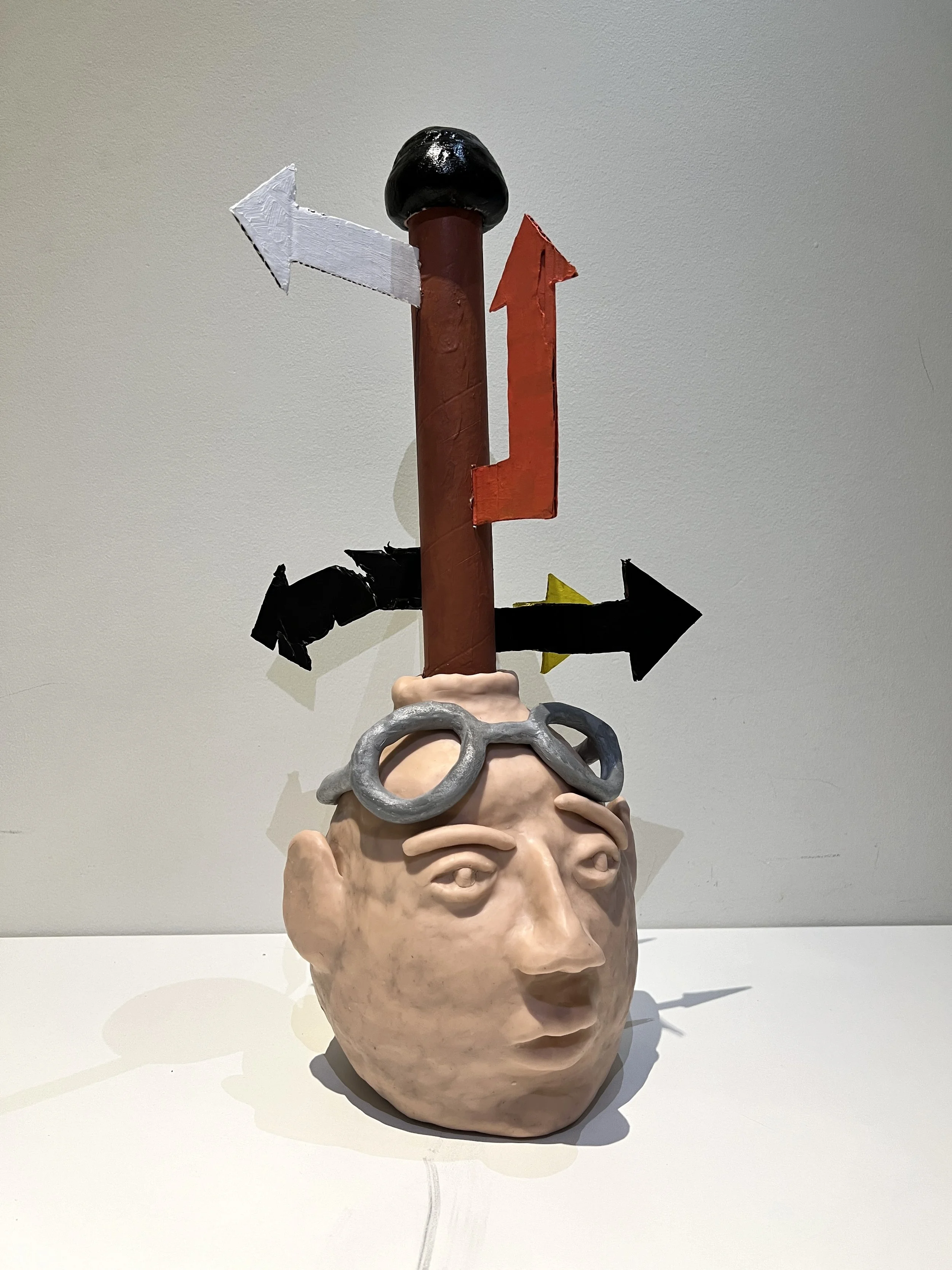 My art piece, "Indecisiveness," explores the theme of uncertainty and internal conflict of one's mind. It is a self-portrait of a clay head sculpture featuring a multi-directional sign emerging from the top of the head. The sign is a metaphor for indecision, where each signpost represents a different idea in a unique form, visualizing the challenge and struggle of choosing which idea or path to follow.