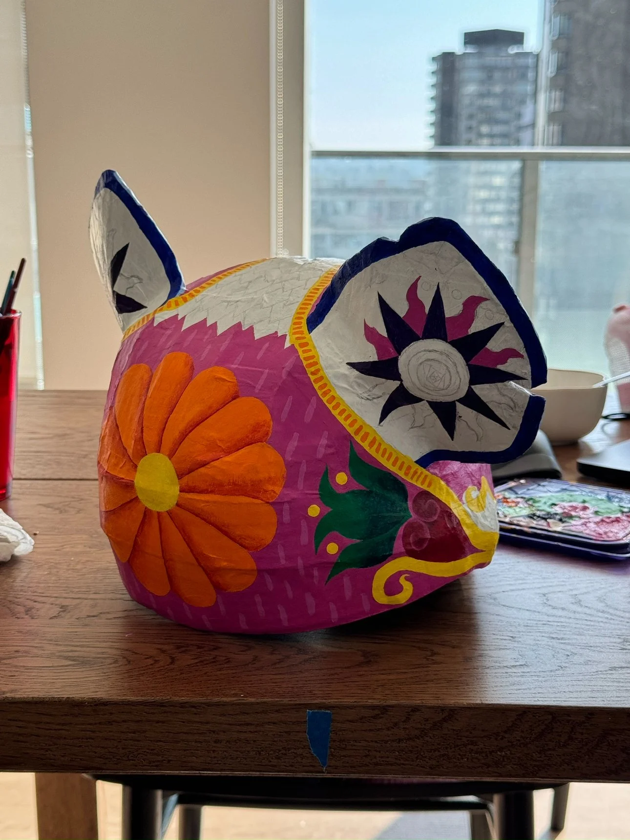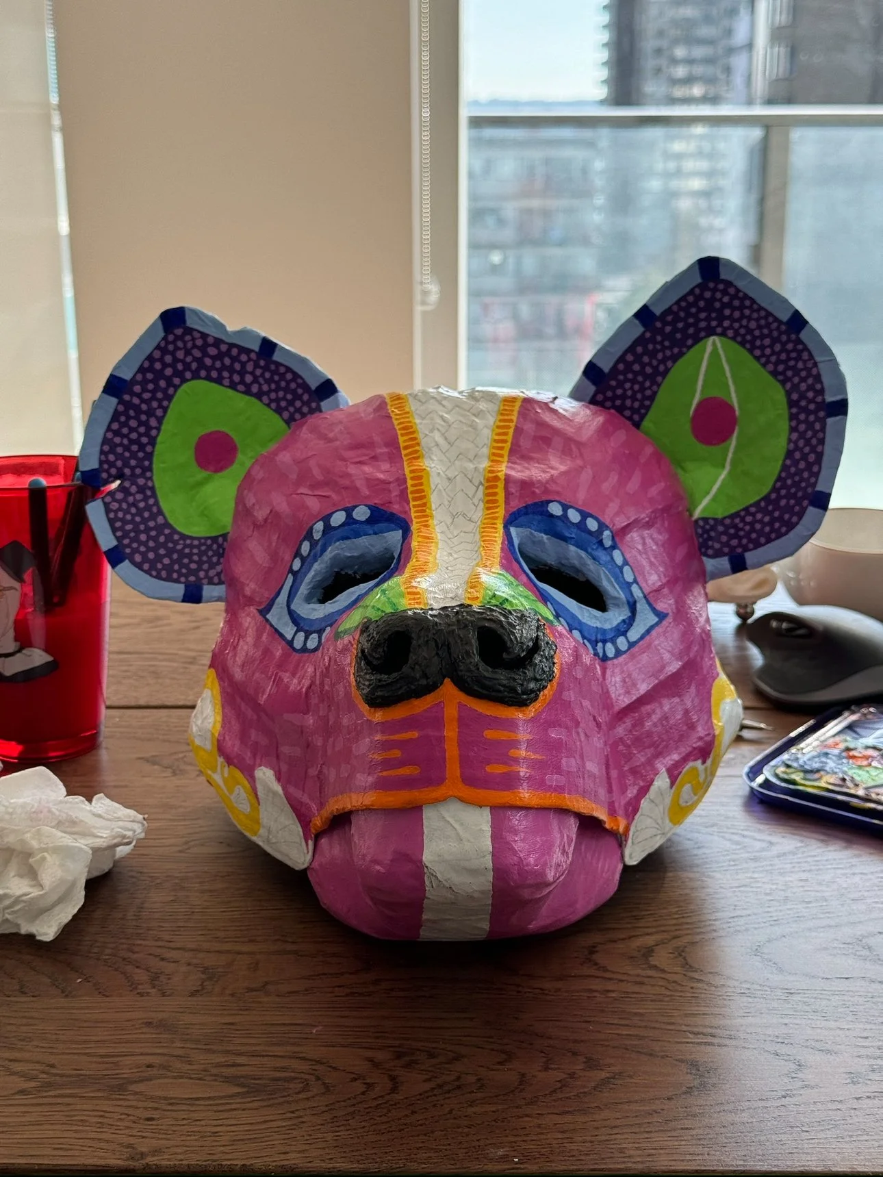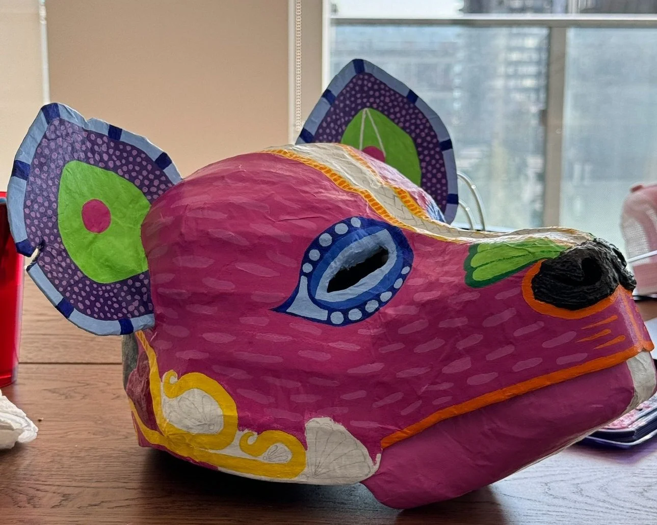 Inspired by the vibrant tradition of Mexican Alebrijes, this life-size cardboard painted with lively details and colors made sculpture delves into "The Exploration of Identity and the Journey of Self-Love."