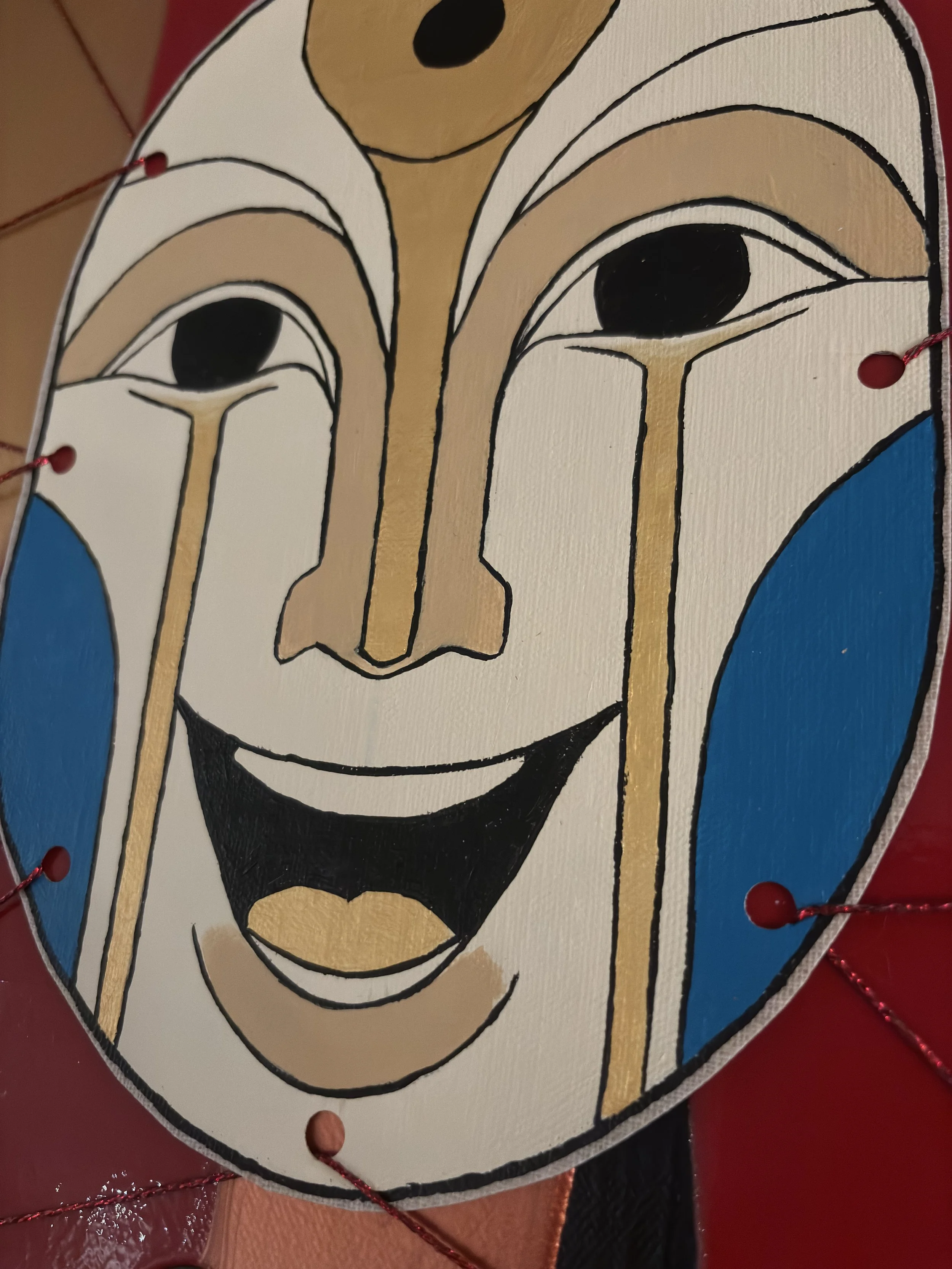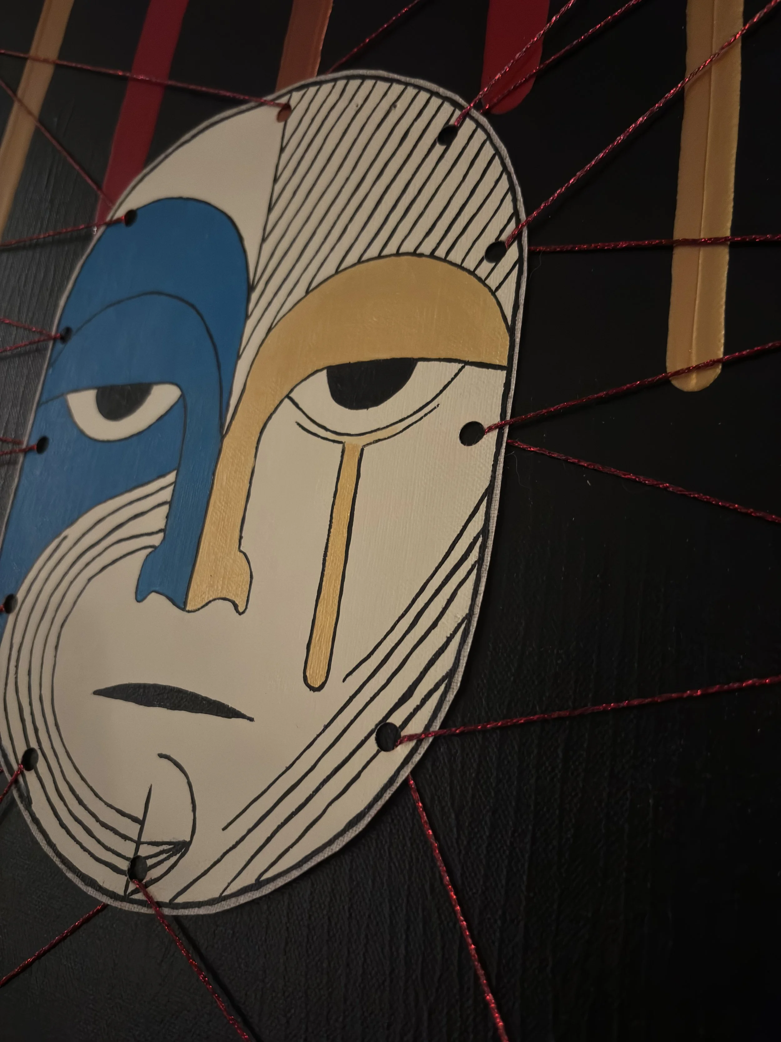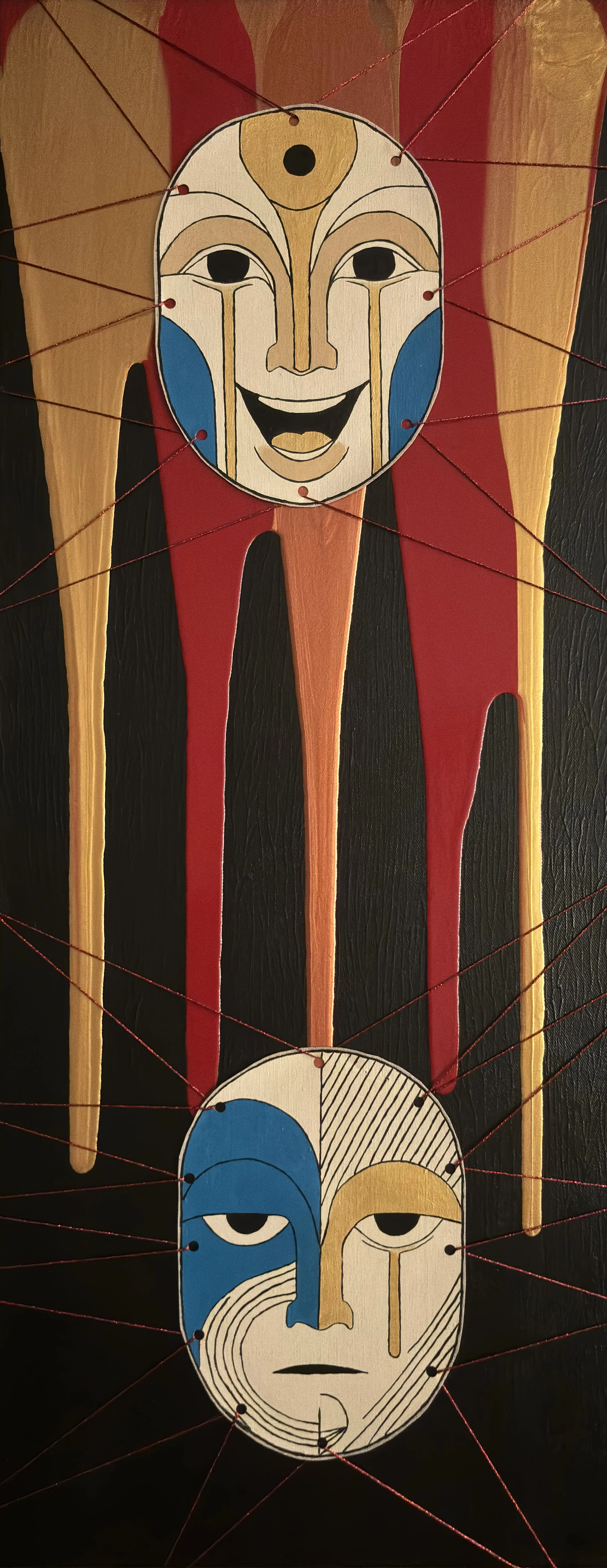 "Desire Bound" looks at how human feelings are connected to the chase for wealth, power, and desires. My inspiration came from thinking about what "success" means today. I noticed that many people, including myself, feel empty inside even after achieving outward success. This struggle and sense of helplessness moved me deeply. I created this piece to show these emotions and encourage viewers to think about their own desires. The artwork shows the contrast between outer joy and inner pain, and how desires can trap us. The black background stands for the deep pit of desire, while the flowing gold and red acrylic fluid shows the mix of blood, tears, money, and desires. The top and bottom of the canvas have masks tied with gold thread, symbolizing emotions driven by desires.