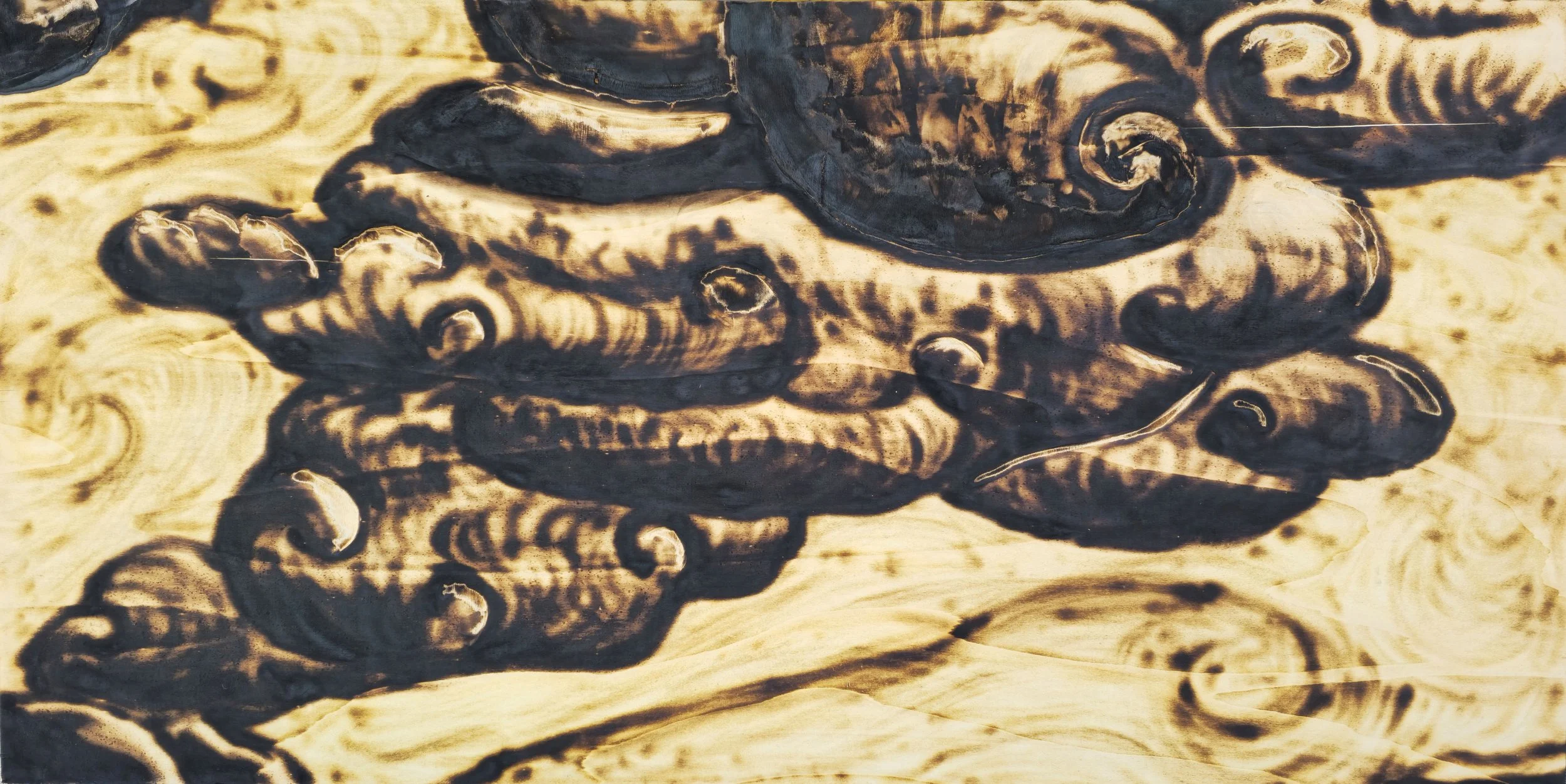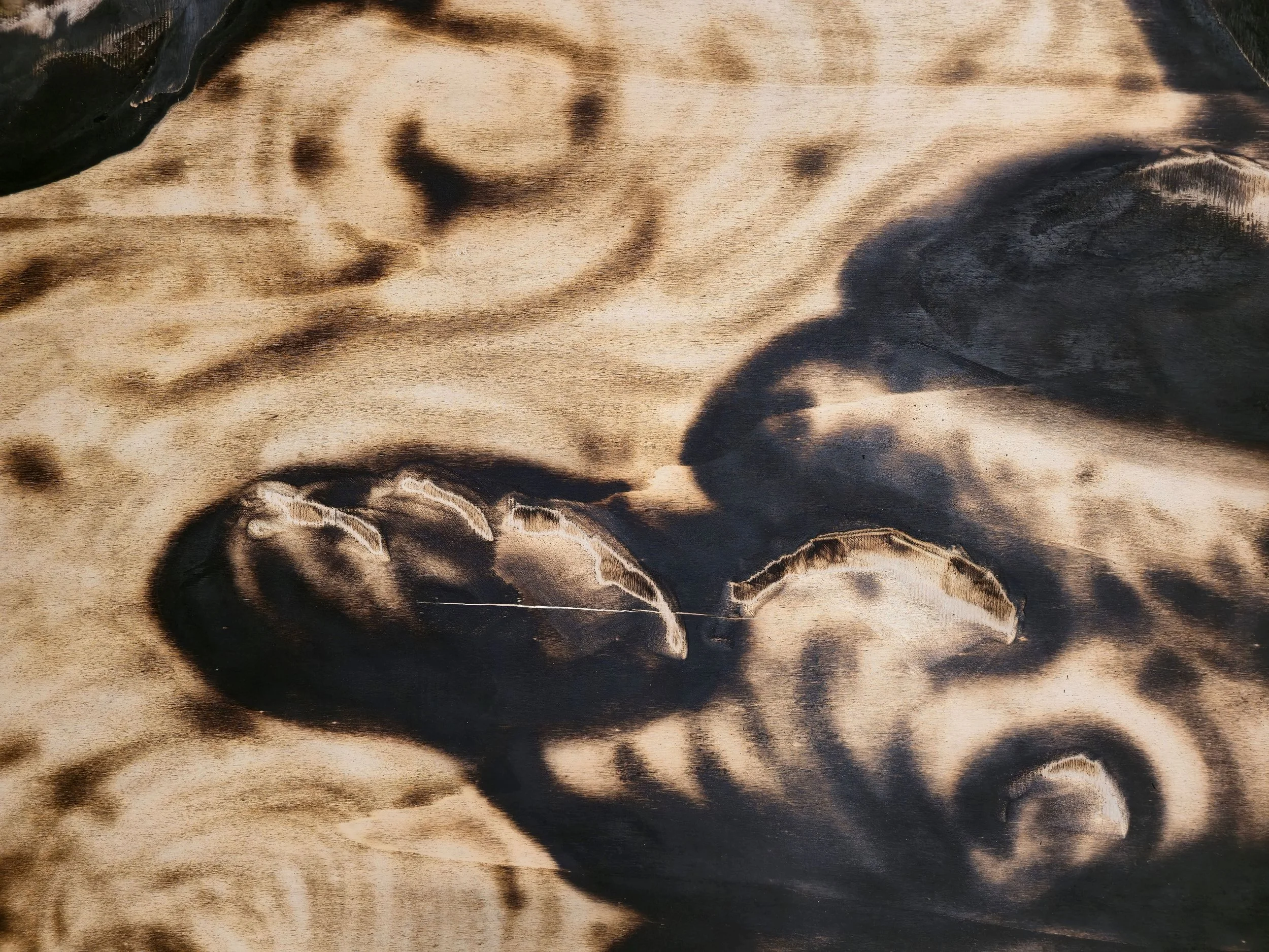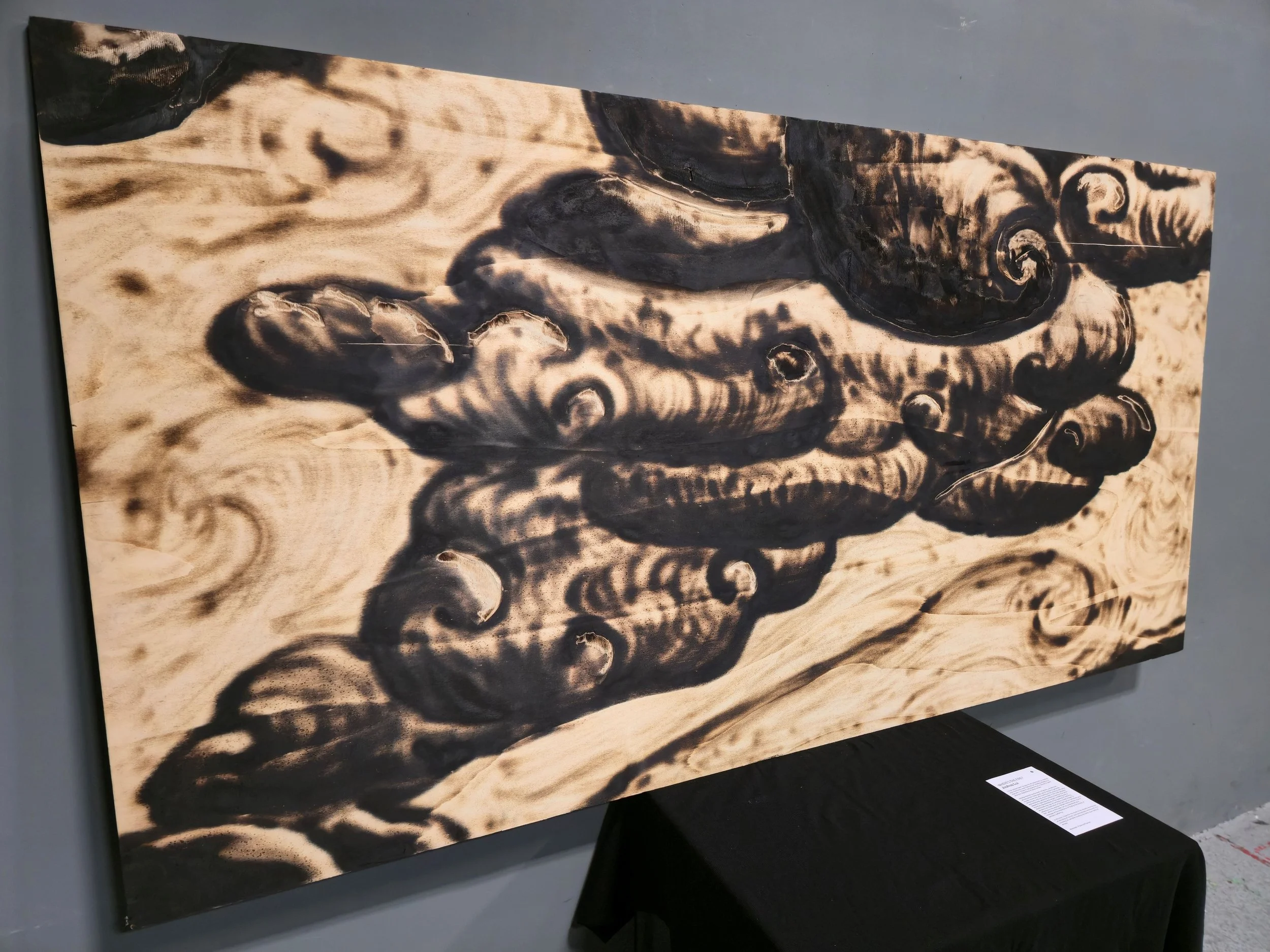 I have always been hungry for an opportunity to explore less commonly used methods for creating imagery. To that end, I chose to use plywood as a canvas to sand and burn depictions of black smoke.