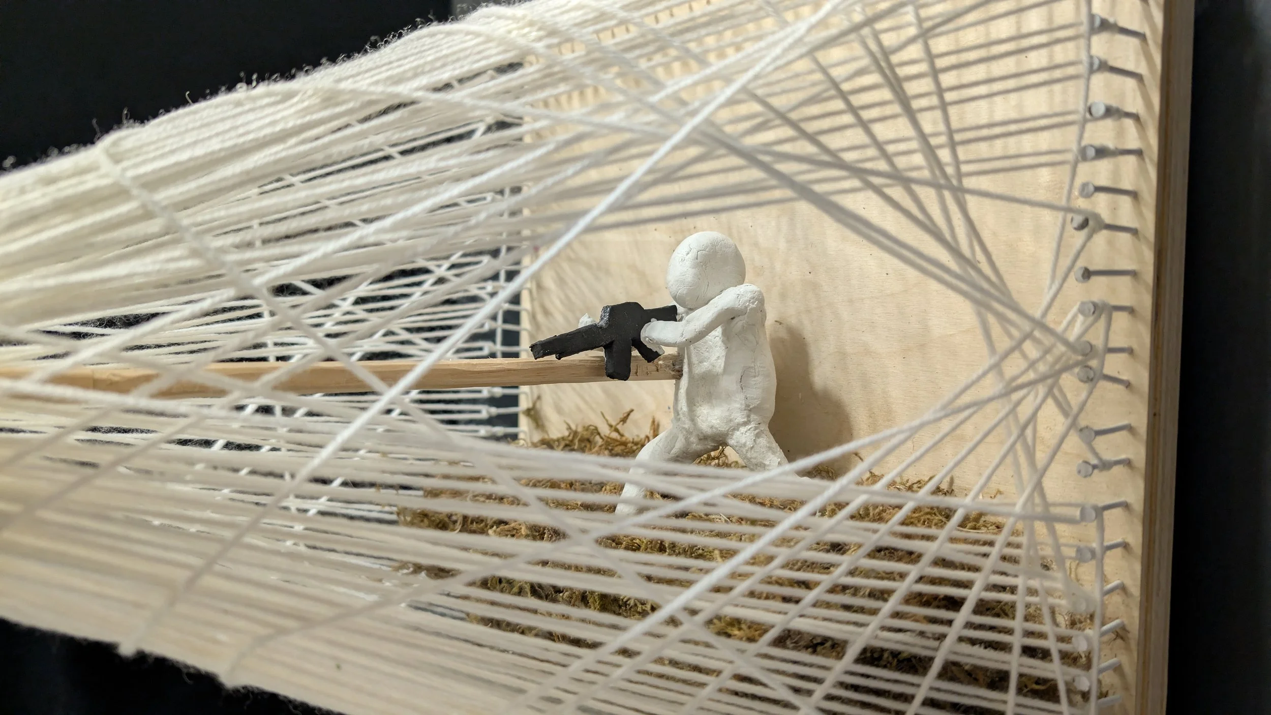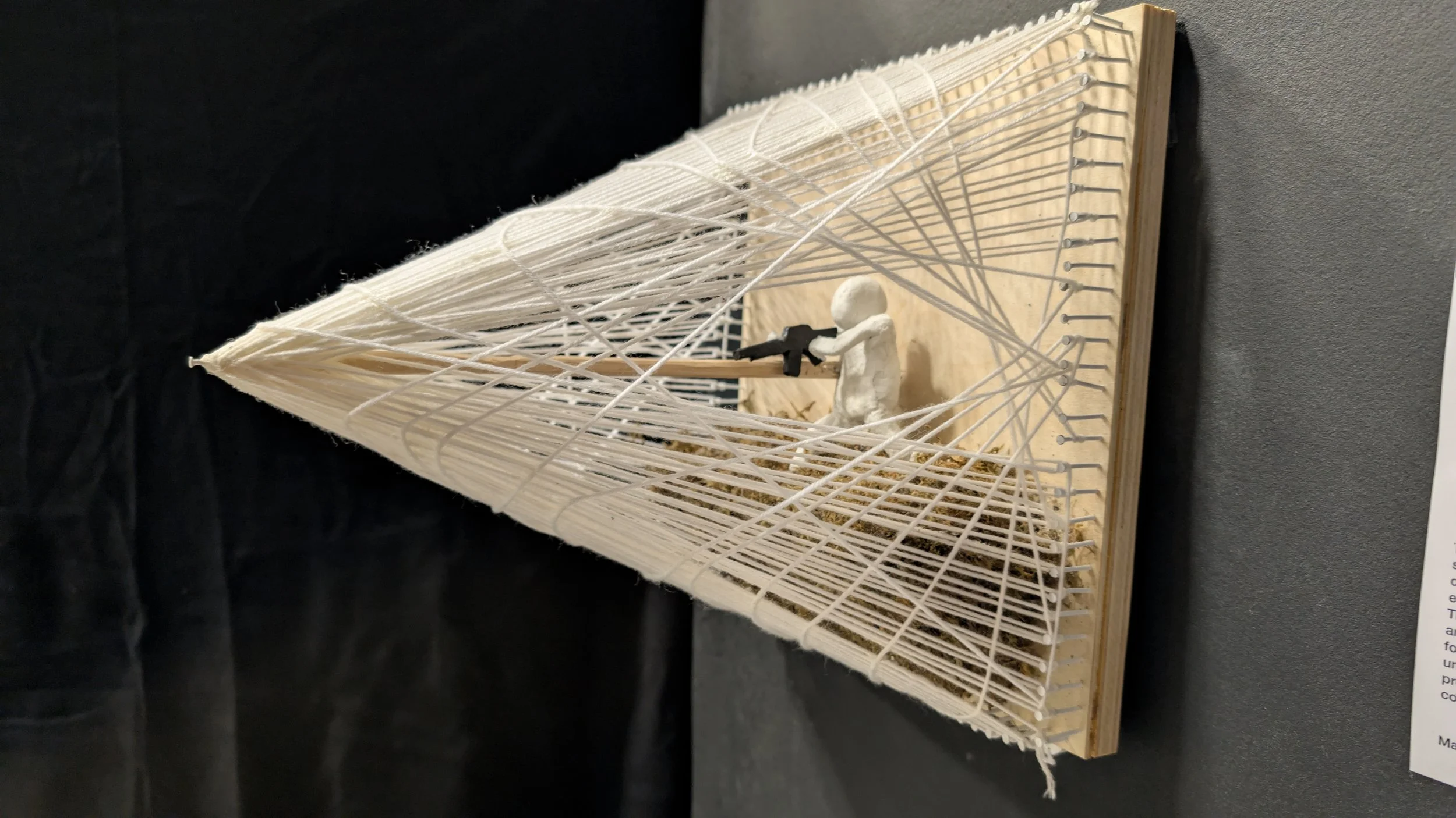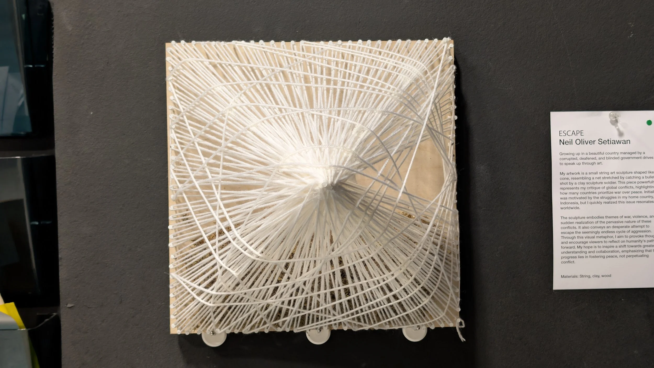 Growing up in a beautiful country managed by a corrupt, deaf, and blind government drives me to speak up through art. My artwork is a small string art sculpture shaped like a cone, resembling a net stretched by catching a bullet shot by a clay sculpture soldier. This piece powerfully represents my critique of global conflicts, highlighting how many countries prioritize war over peace. Initially, I was motivated by the struggles in my home country, Indonesia, but I quickly realized this issue resonates worldwide.