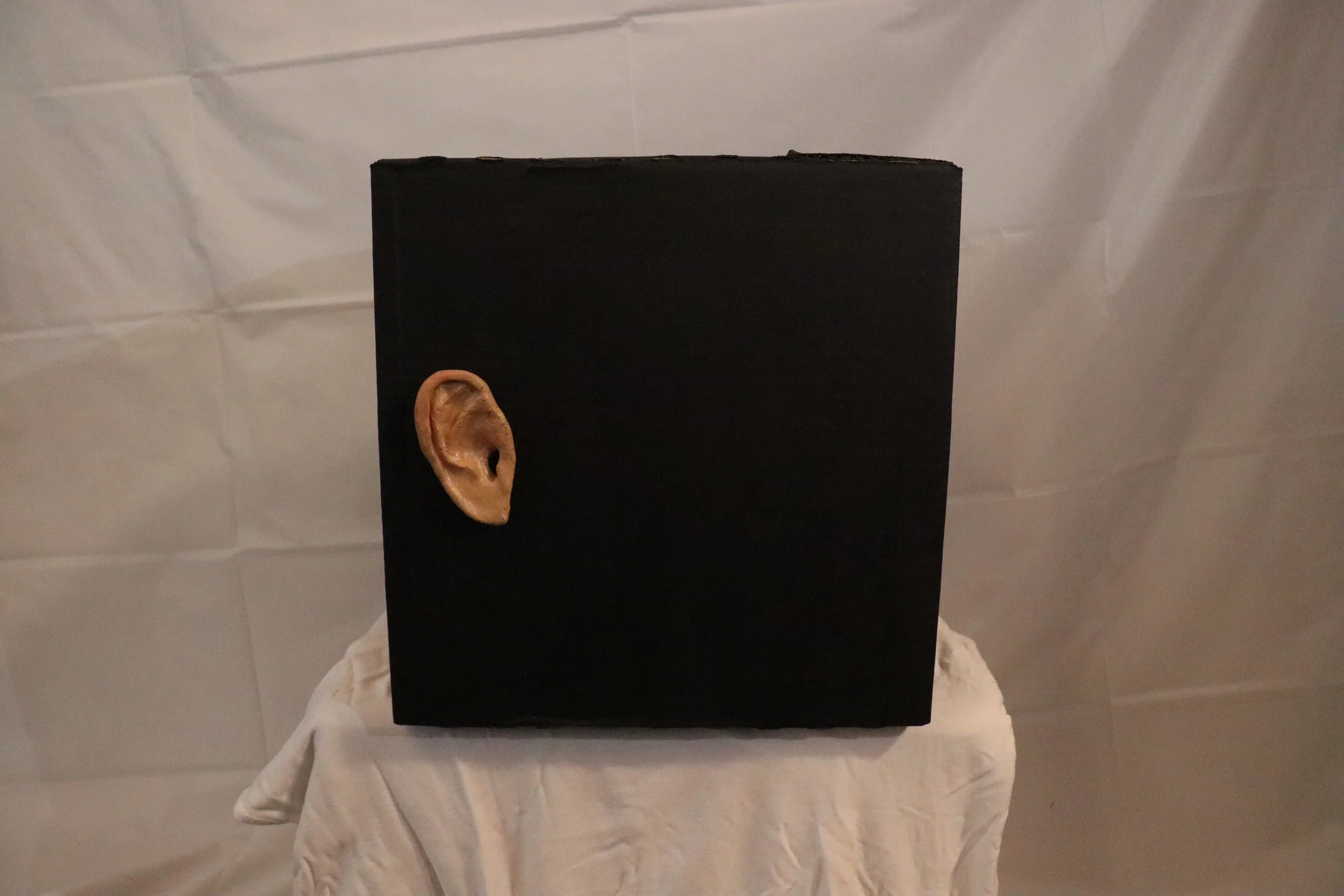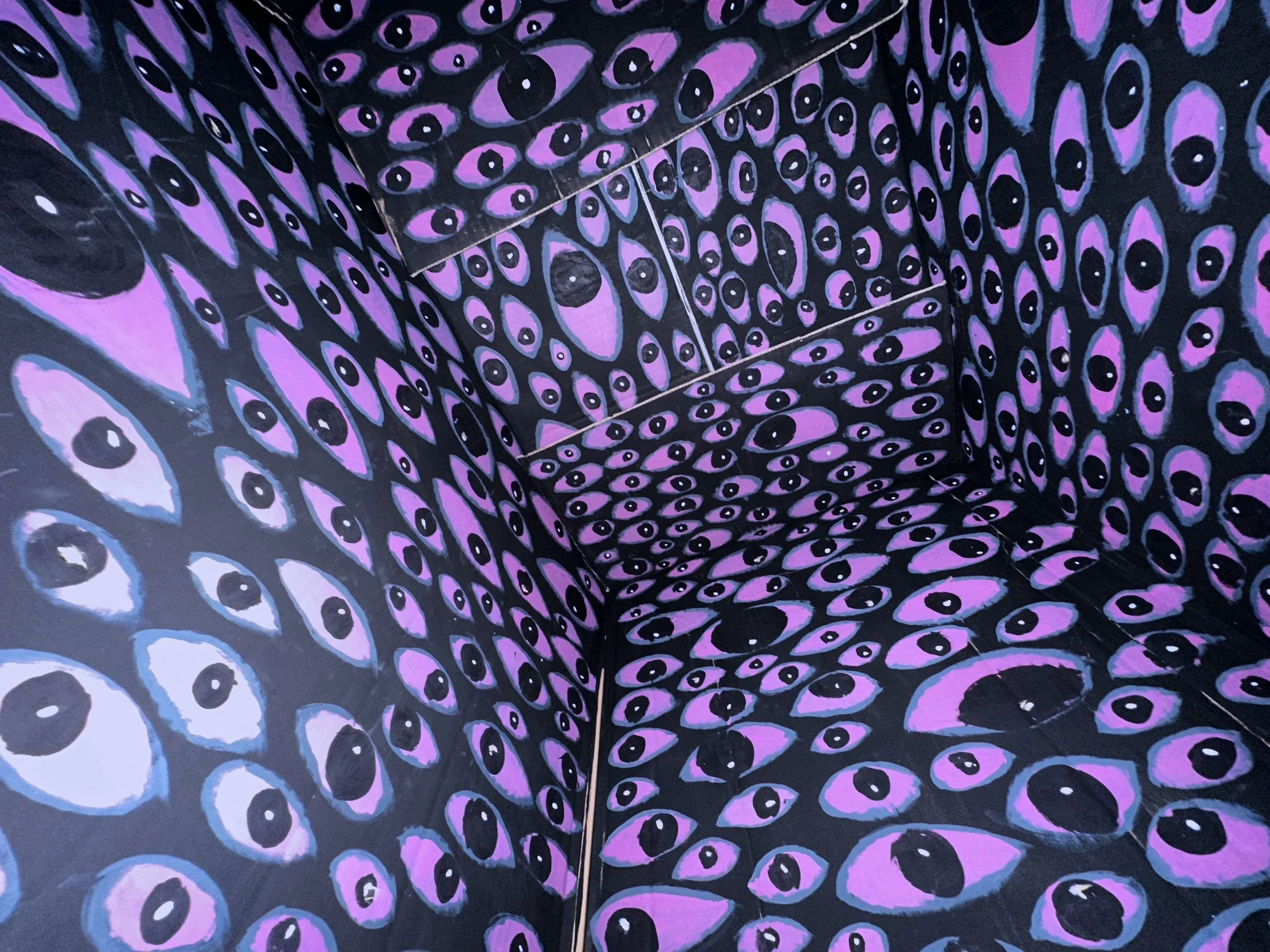 To pay homage to one of my mother's art finals, I have created All Eyes on Me, an experience about life's emptiness. This piece is meant to convey the feelings of anxiety and loneliness. For years I struggled with these exact feelings and the creation of this box is a direct manifestation of my experiences. The isolation acts in a literal and metaphorical way. Loneliness can be literal in the way of cutting off yourself from others, the same way it can be a mental battle through the entrapping feeling your mind can create. Both of these factors are expressed in the box. Creating this as an experience rather than just a visual piece was incredibly important to me because the medium of 3D can convey much stronger emotions than a flat art piece. The judging eyes everywhere you look add to the feeling of isolation, you are alone, you are the focal point.