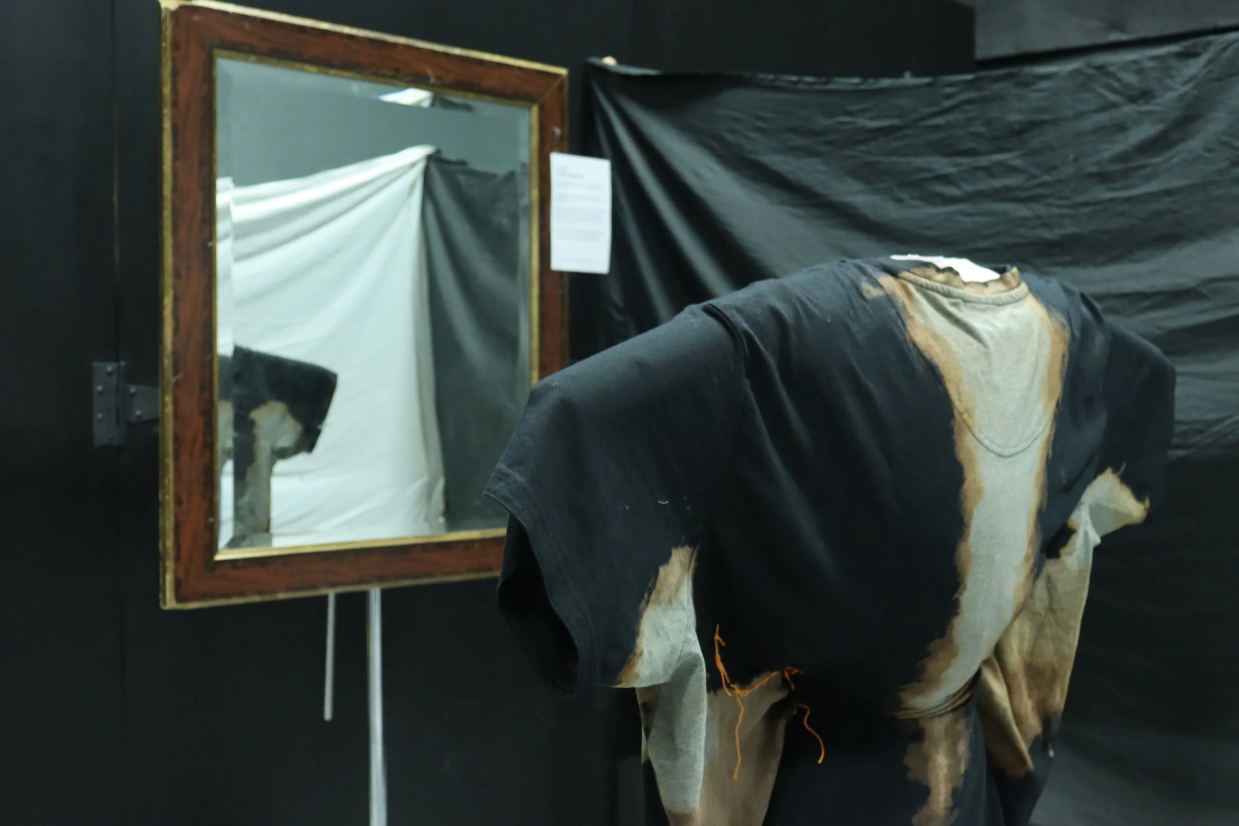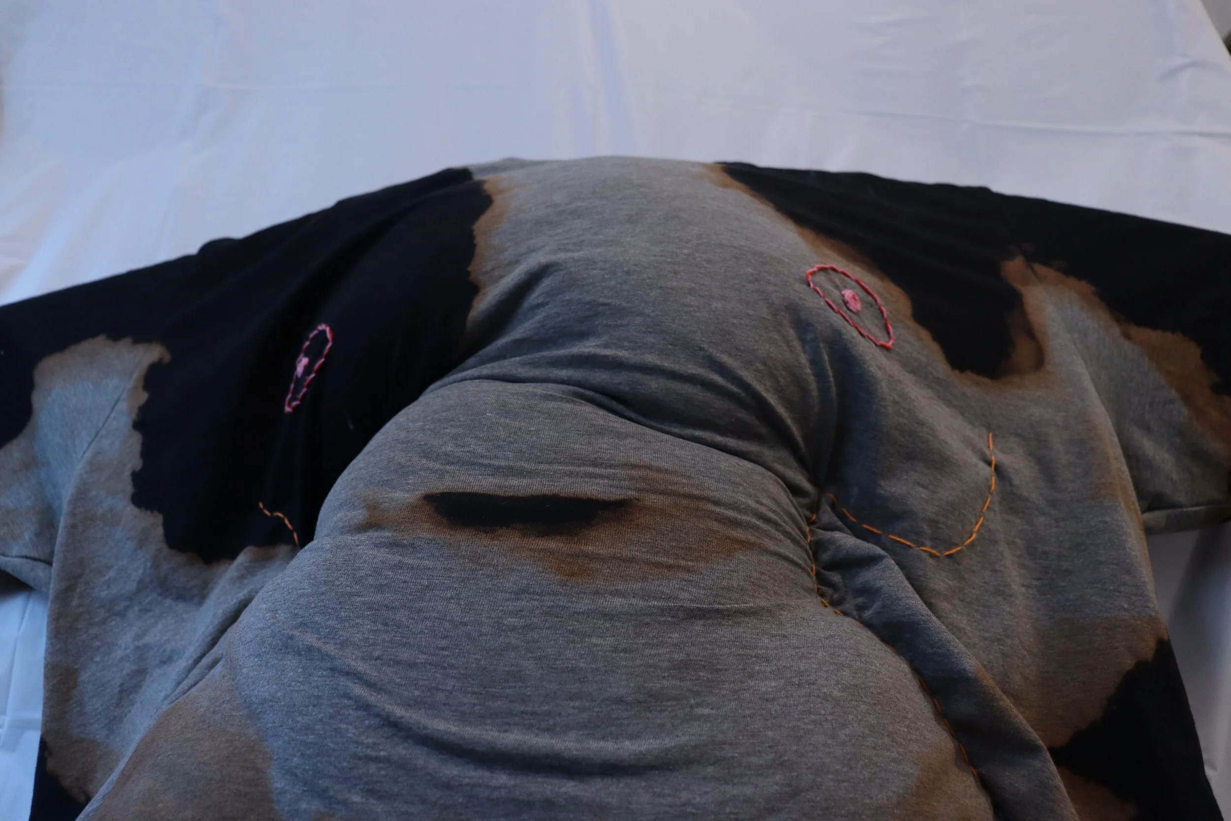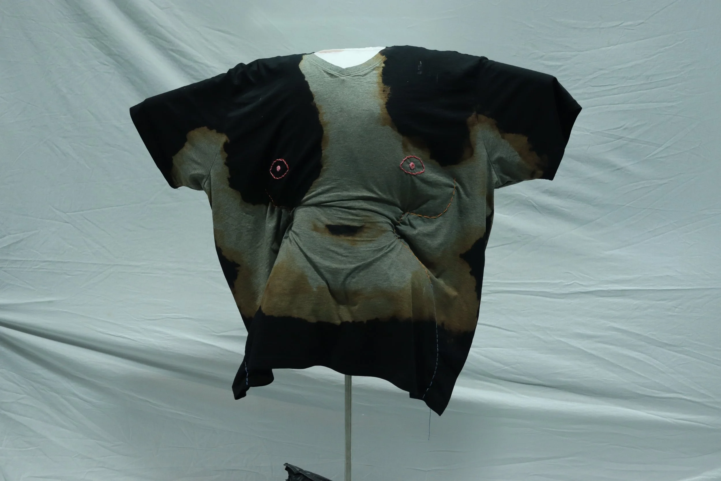 Seeing a plus-size store on the other side of the street every day made me realize how normalized fatphobia really is. "Are fat people so disgusting that we need to be banished from normal clothing stores?" is a thought I've had because of this. And it's got me thinking about the internalized fatphobia we all have, even though we want to ignore it. So, I created this sculpture from a 4X T-shirt, painted with bleach where sweat usually stains your clothes, and used embroidery to mold the shirt into what everyone thinks people should want. And I want you to see it. I want you to be able to stare into your own eyes in this body and face yourself. Just like I have to do every day. Not with prejudice nor distaste, but with acceptance and understanding.