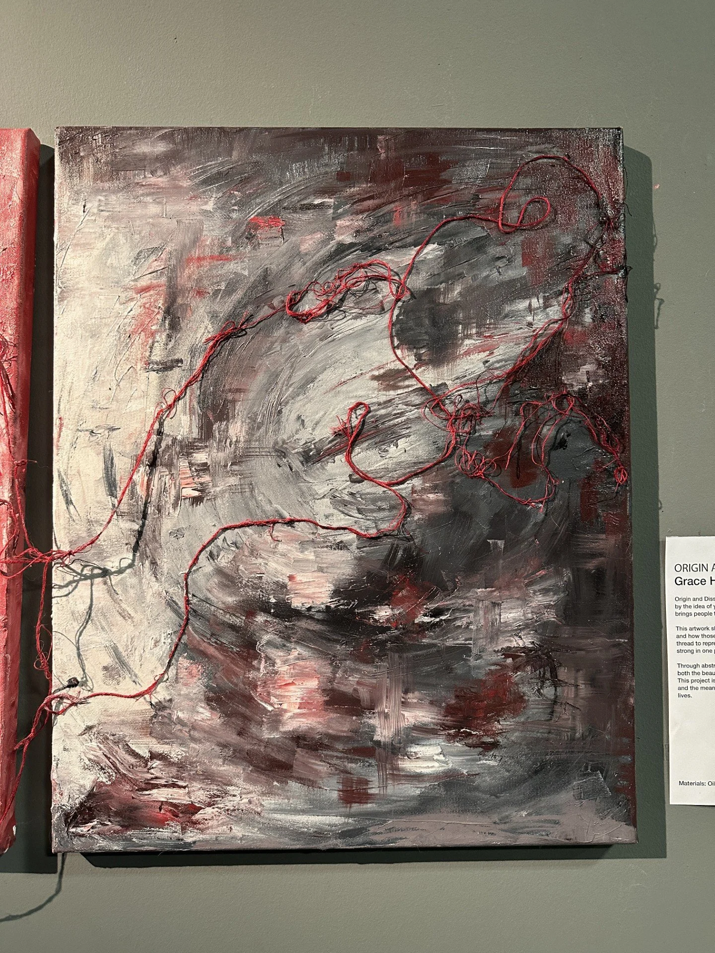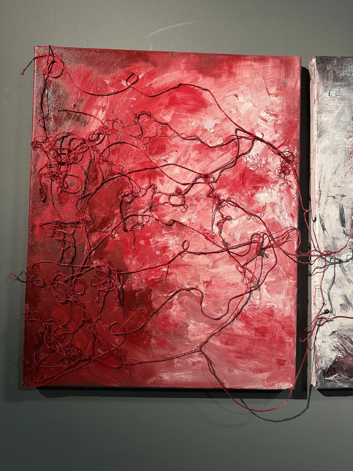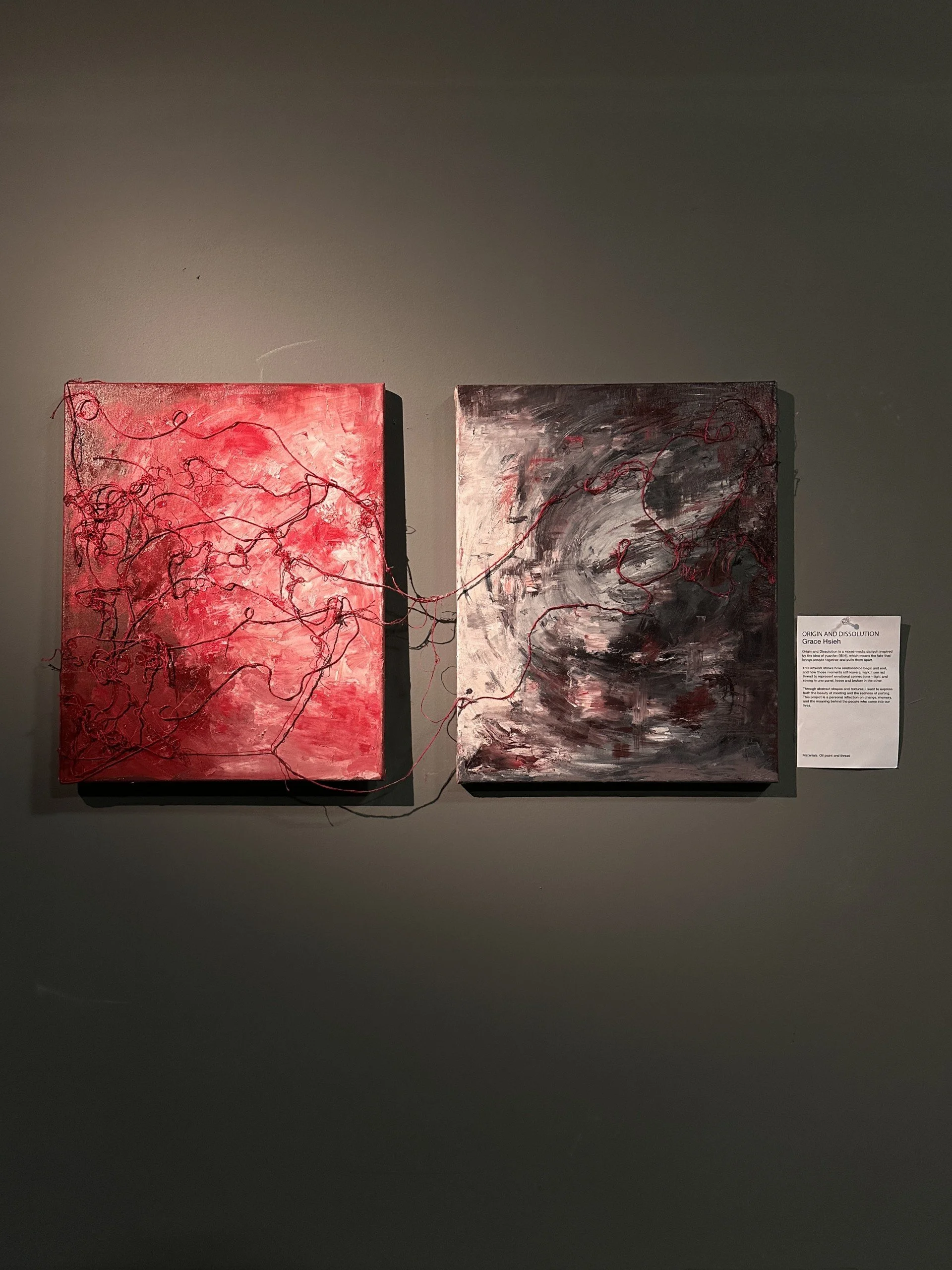 Origin and Dissolution is a mixed-media diptych inspired by the idea of yuanfen (緣分), which means the fate that brings people together and pulls them apart. This work shows how relationships begin and end, and how those moments still leave a mark. I use red thread to represent emotional connections—tight and strong in one panel, loose and broken in the other. Through abstract shapes and textures, I want to express both the beauty of meeting and the sadness of parting. This project is a personal reflection on change, memory, and the meaning behind the people who come into our lives.