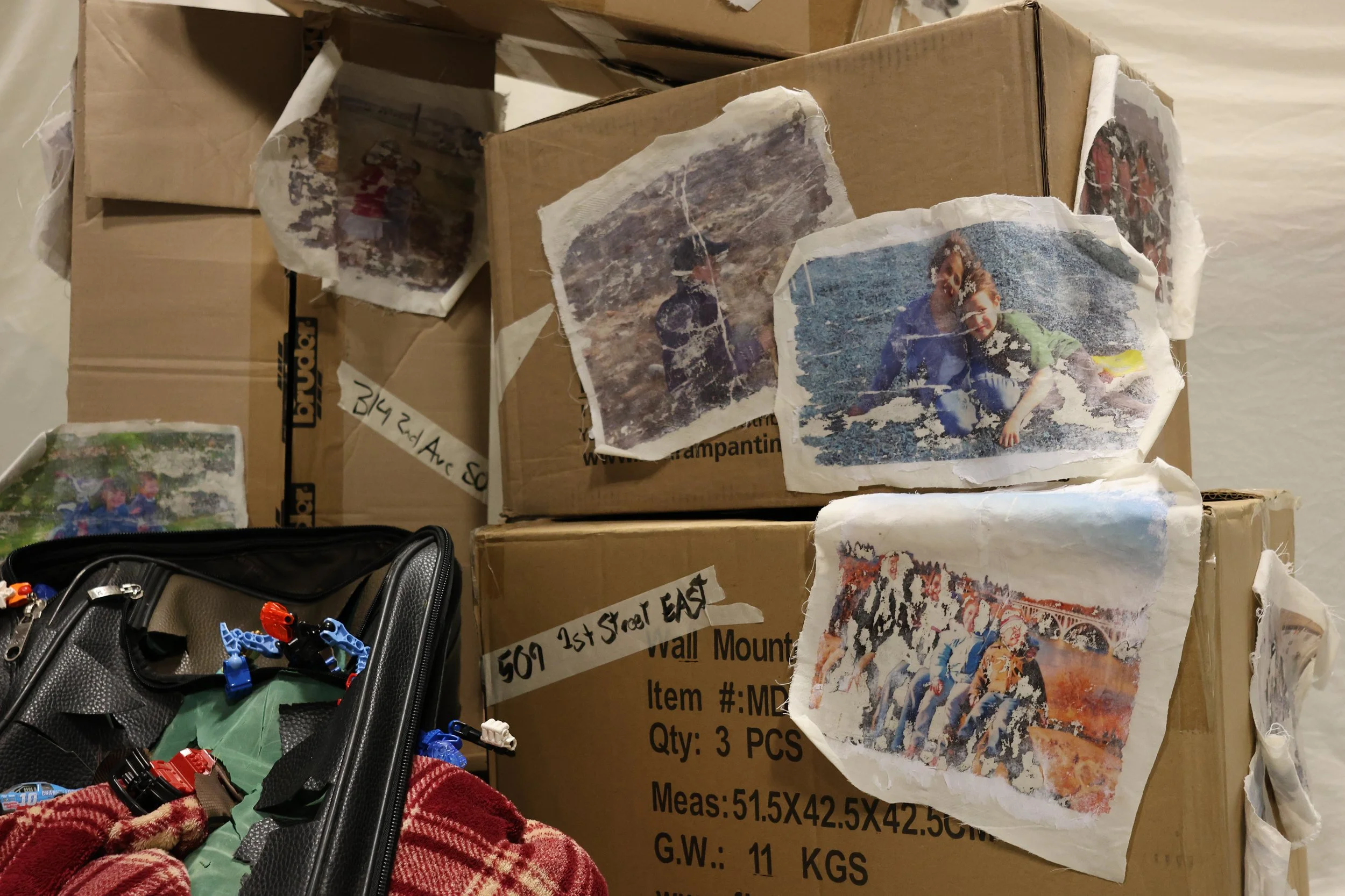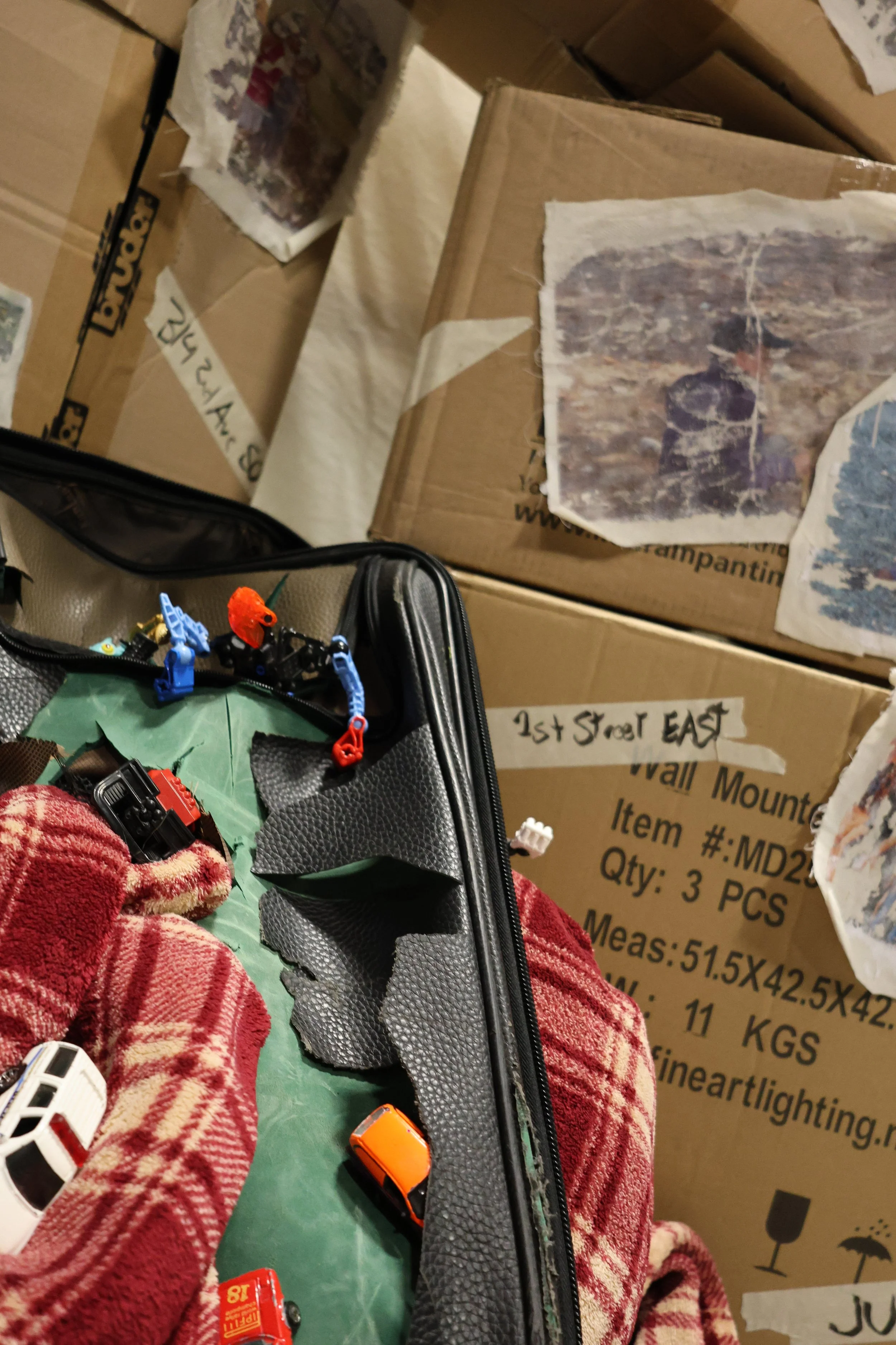 Materials: Suitcase, Cardboard boxes, Fabric, Printed Images, Toys, Clothing, Marker
