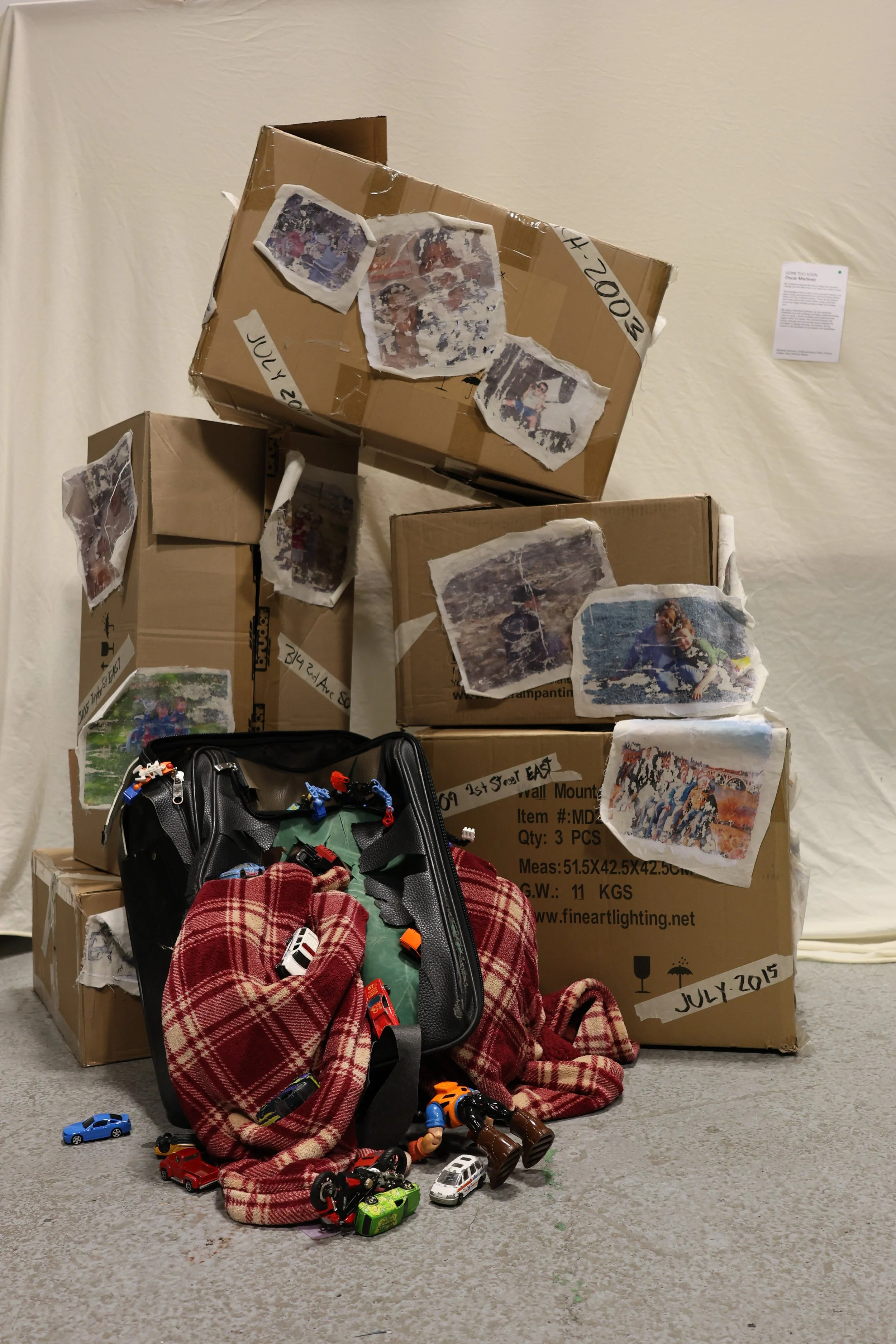 The passage of time is also a very prevalent theme in my piece, being emphasized by the personal family photos stuck onto the cardboard boxes. These family photos have been stuck onto cotton fabric using a process known as image transfer, giving a rough and vintage look. By using a destroyed suitcase, my own personal childhood toys and clothing, and large cardboard boxes, I aim to create a sense of fatigue and weakness that lingers within the viewer. The contrast between the broken suitcase and the looming boxes displays the inevitably of change, and how as children, we are subject to the decisions of our parents and guardians.