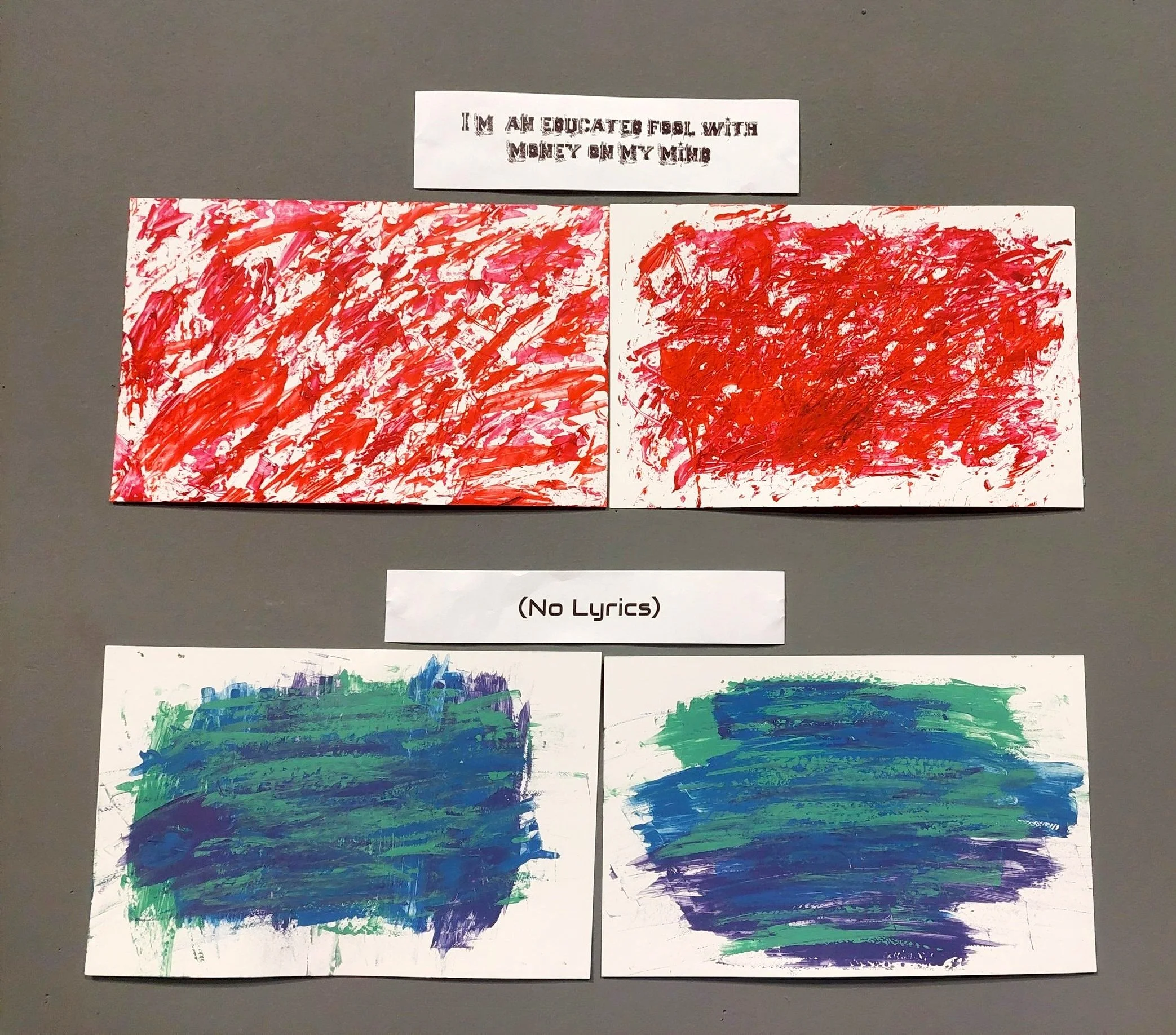 I used many unconventional tools to paint, such as Popsicle sticks, cardboard, paper clips, and a plastic fork, to help convey what I was feeling. I gave myself an hour to paint each piece. I decided to keep the mistakes, because failure is an essential part of the artistic process.