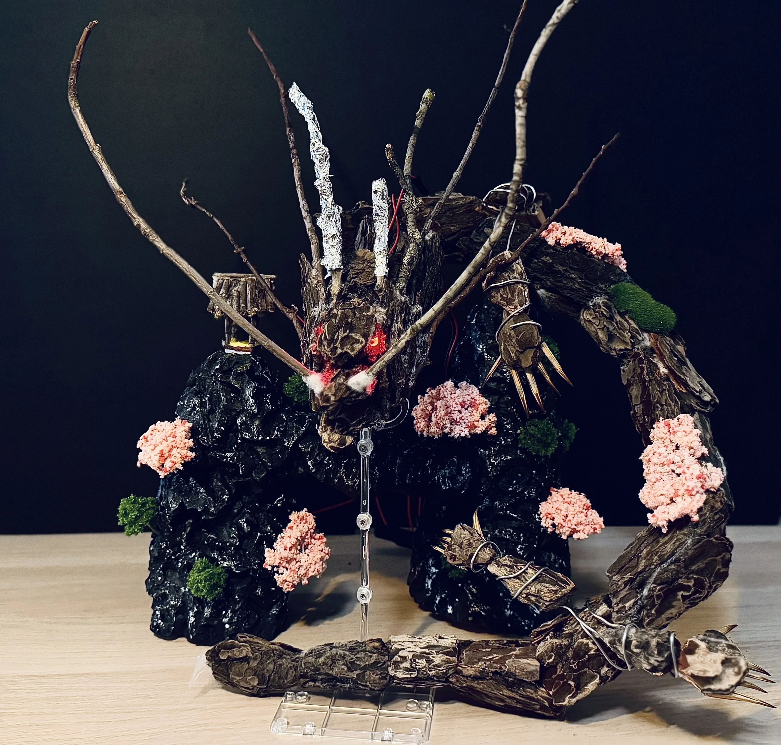 This dragon sculpture is made of stone, metal, and wood. The three materials represent the evolution of human tool usage — from the earliest use of wooden sticks, to chipped stone tools, and then to metal smelting.