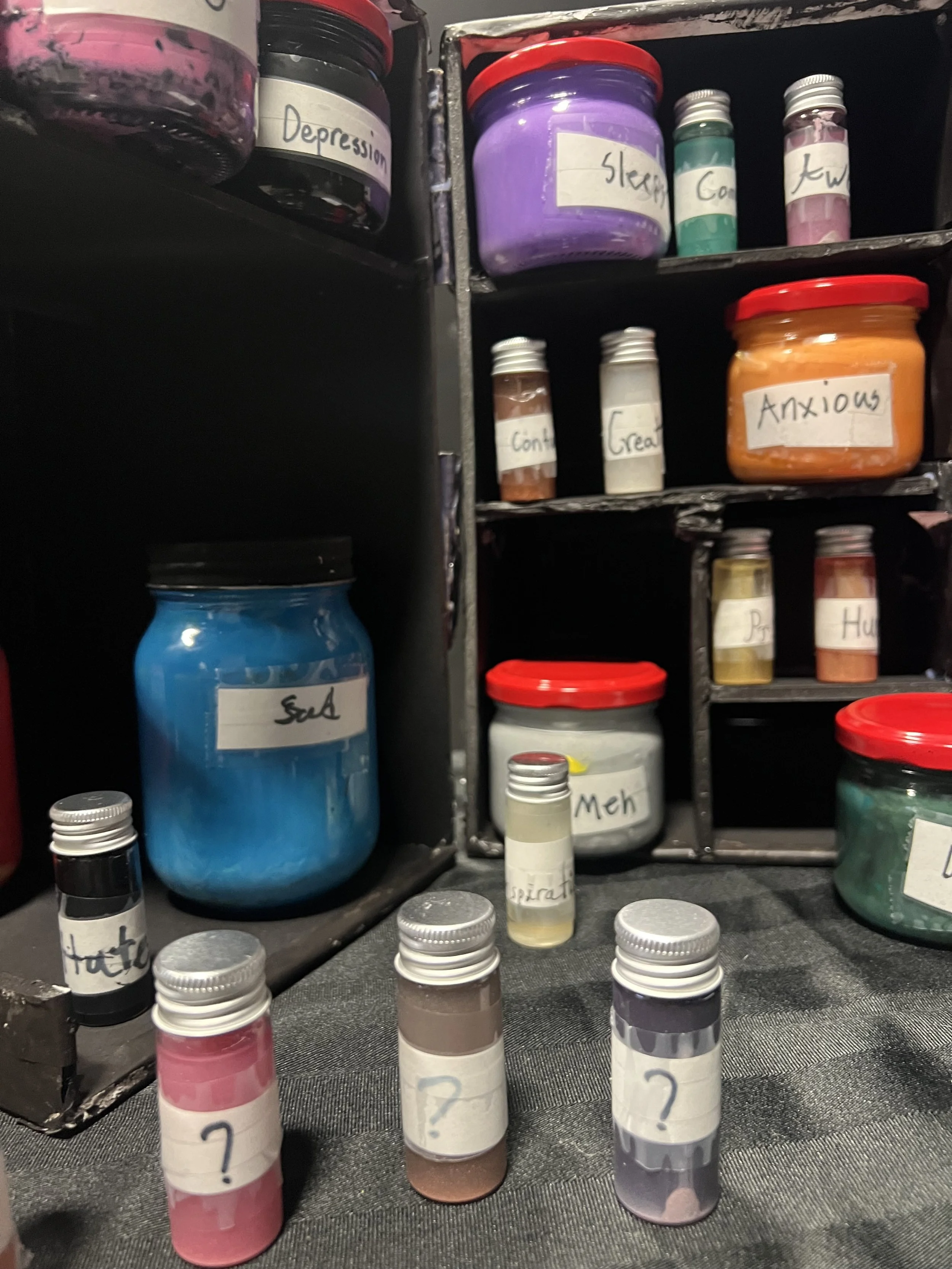 "Emotional apothecary” was inspired by the way my family handle the cultural values of each generation after generation. We were taught how to handle our emotions, and the act of being emotional in public. Emotions were seen as something that we should hide and never to be seen by anyone. My grandmother is a major influence of my life, and she always will be, but her way of bottling up emotions. It affected me differently than it does her. Each jar is a representation of what emotions I bottled up through my life.