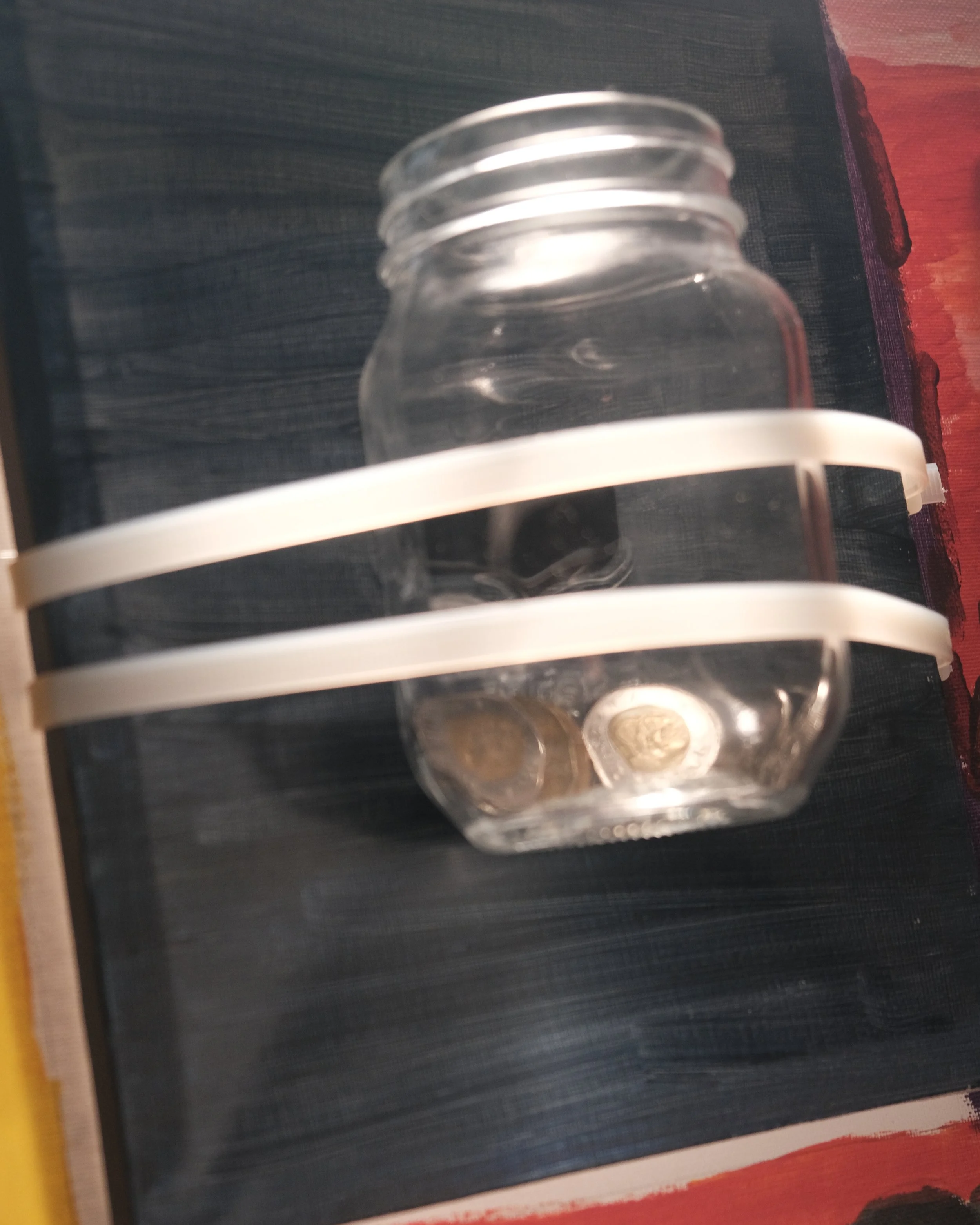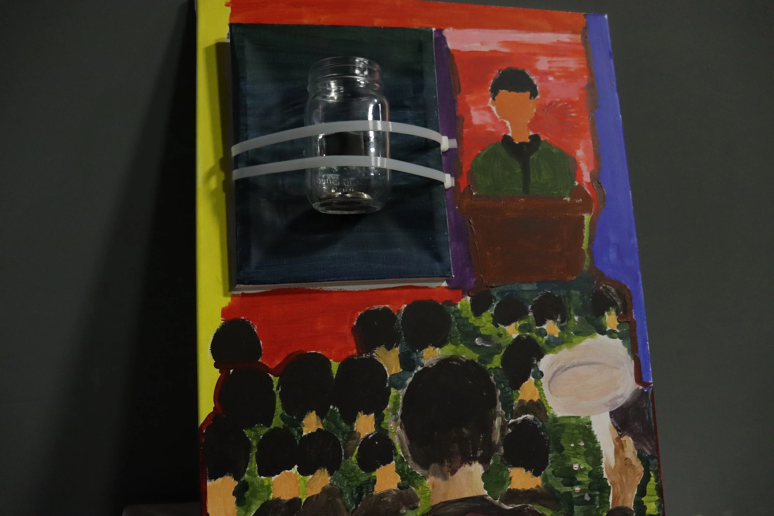 I aimed to create a work that is not just to be viewed, but one that invites interaction between the artwork and the audience. You can place money into the jar that is being auctioned inside the painting. As you do, the value of the artwork depicting the auction increases in an interactive, reciprocal way.