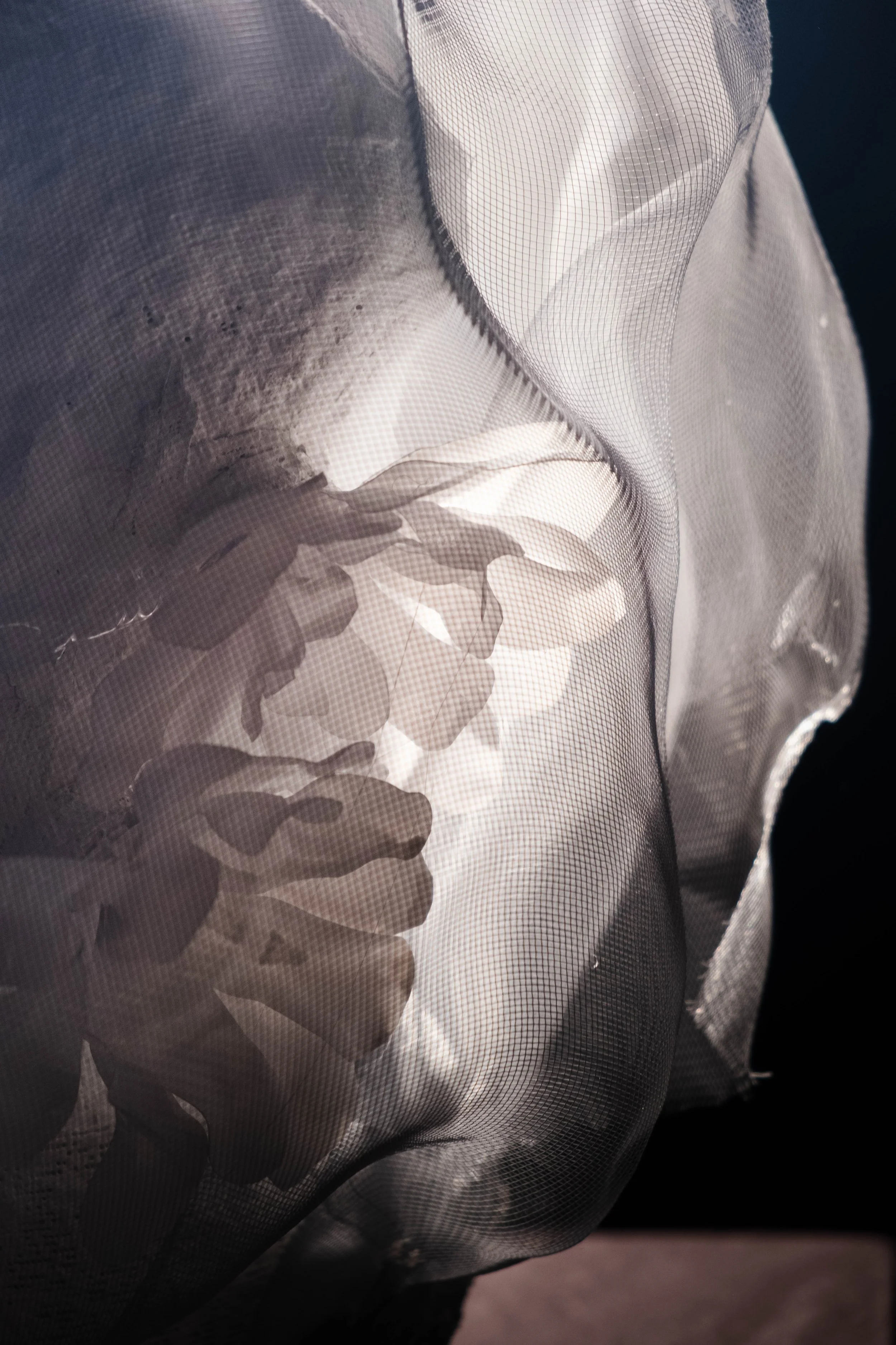 A pale form rises from a world that has stopped breathing, yet within its stillness, something fragile continues to grow. Covered, protected, and restrained, it survives not because it is alive, but because it cannot die.